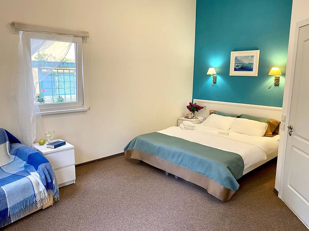 Удобный номер с тремя односпальными кроватями. Отличное решение для 2−3 гостей, которые привыкли к комфортному размещению, идеальный вариант для семейной пары с одним или двумя детьми. Номер расположен на первом этаже двухэтажного корпуса, имеет дополнительный вход со стороны улицы и небольшую персональную зону отдыха. Такое расположение позволит вам например: расположить детский бассейн прямо у номера и дети всегда будут под вашим присмотром или провести приятное чаепитие, любуясь видом пролива.Услуги и удобства