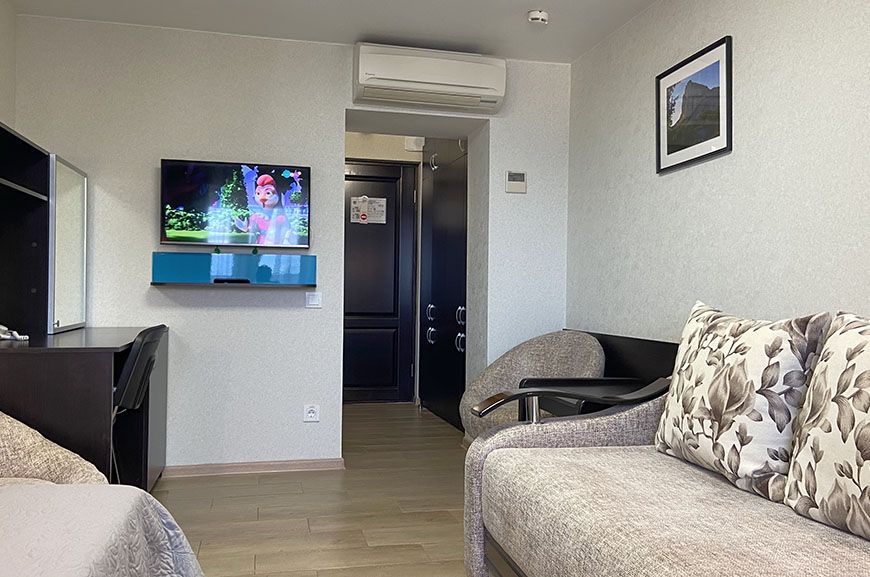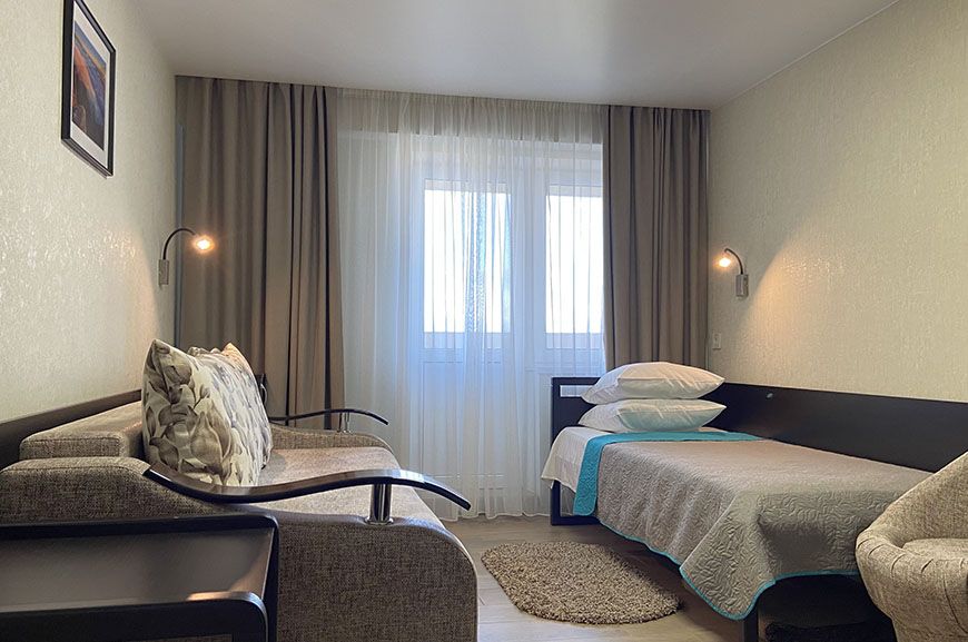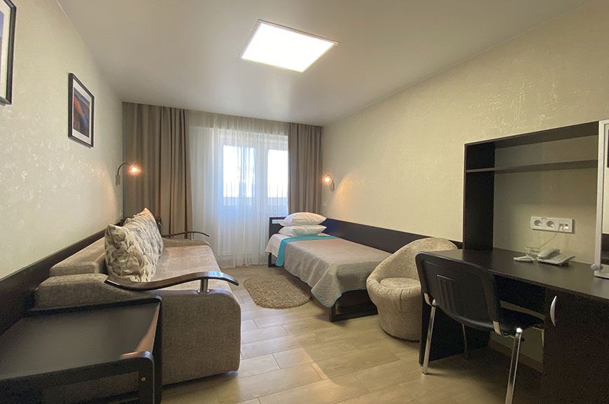 Удобный, комфортабельный номер укомплектован одноместной кроватью и диваном.