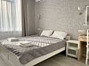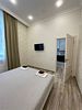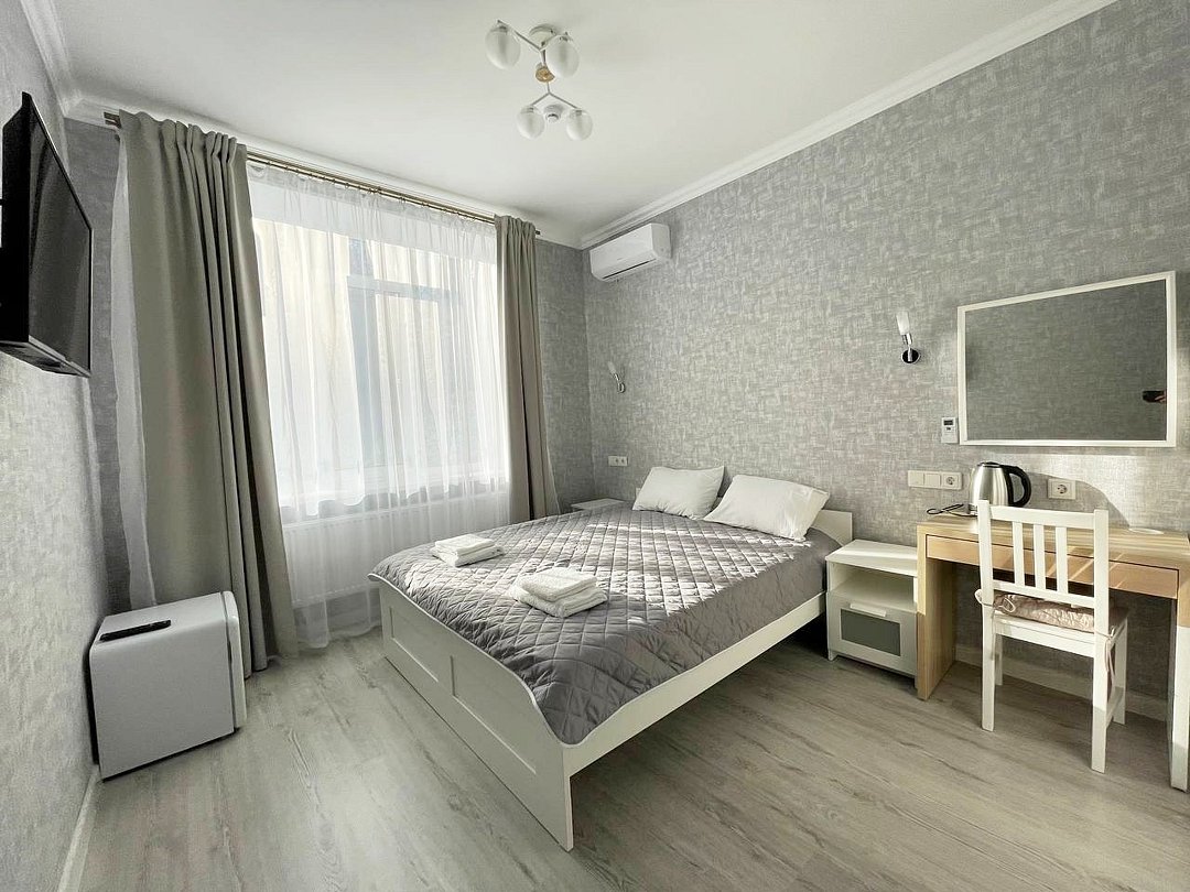Уютный светлый однокомнатный номер для двоих. В номере: кровать, кондиционер, телевизор.