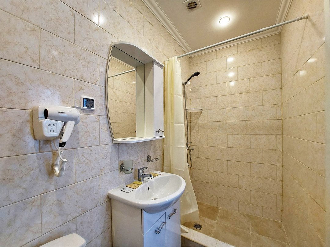 Просторный уютный номер для троих с ванной комнатой. Ванная комната с душевой кабинкой. В номере набор полотенец, мини-парфюмерия, фен, кондиционер, телевизор, электрический чайник, мини-холодильник.