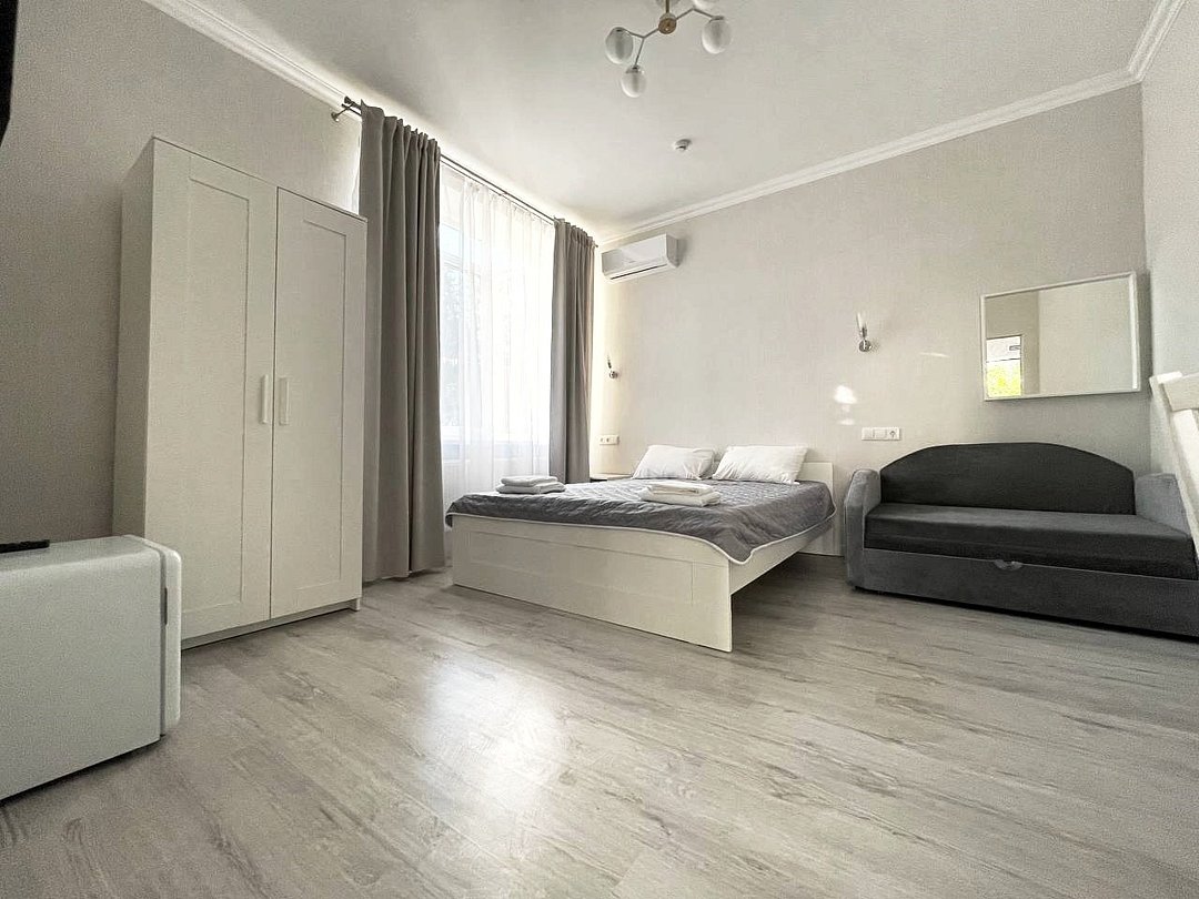 Просторные светлые номера-студии с отдельным входом и собственной оборудованной кухней со всем необходимым для самостоятельного приготовления. Большие окна наполняют каждое помещение светом и создают ощущение простора и легкости.