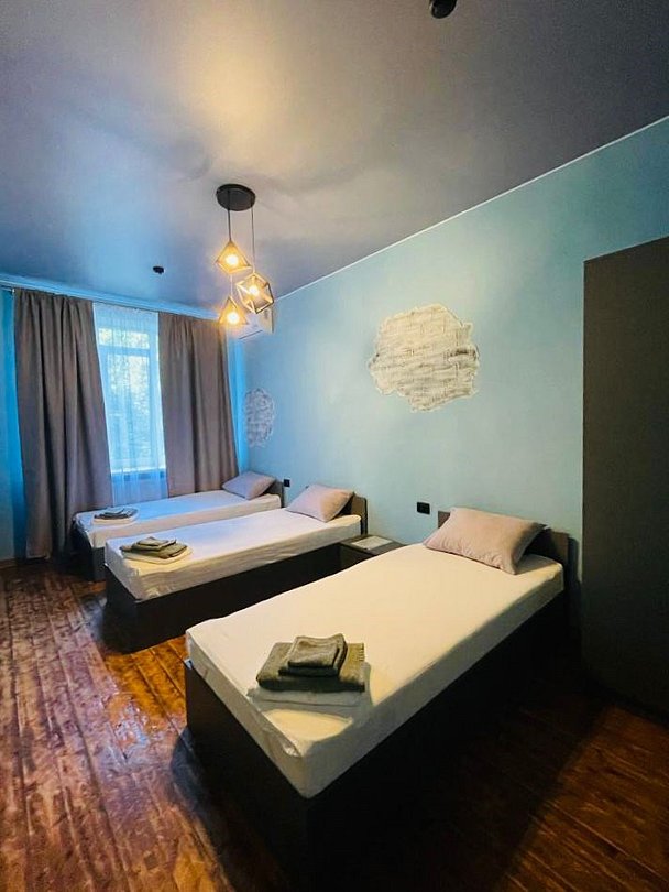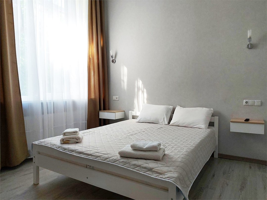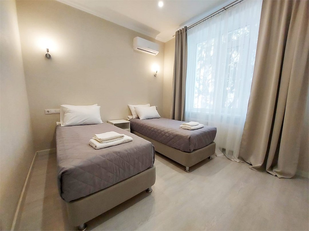 Уютный светлый однокомнатный номер для троих. В номере: кровати, кондиционер, телевизор. Предоставляются банные полотенца.