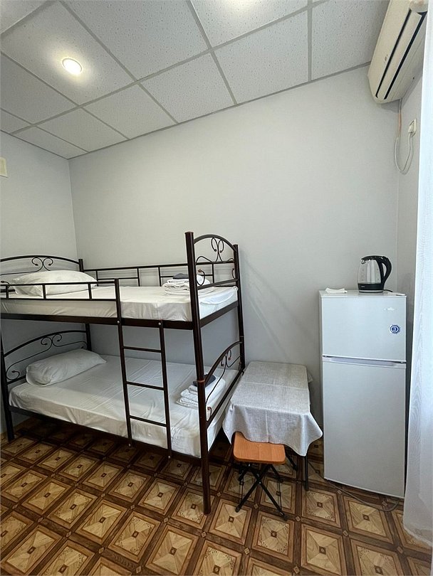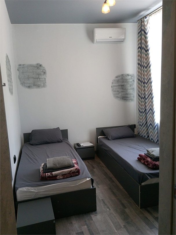 Уютный светлый однокомнатный номер для четверых. В номере: кровати, кондиционер, телевизор. Предоставляются банные полотенца.