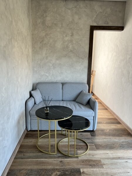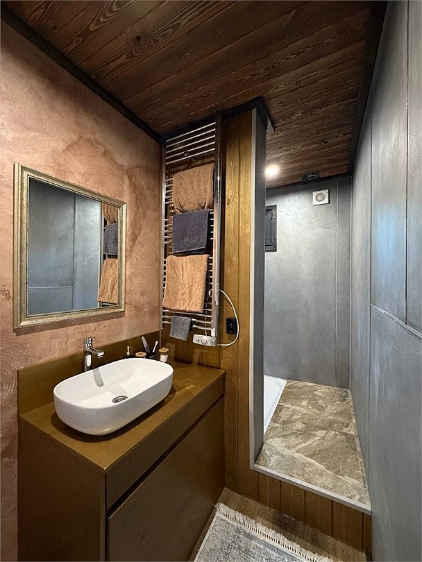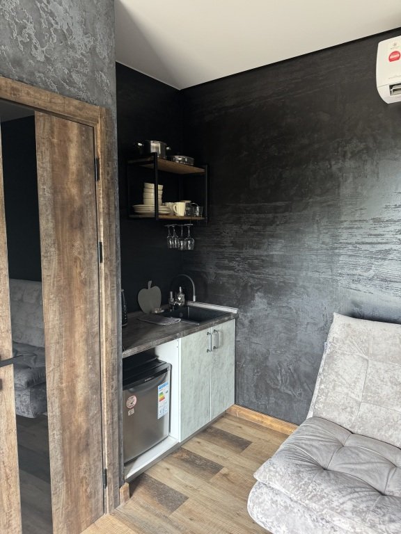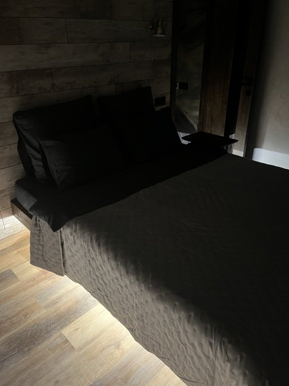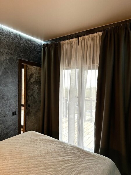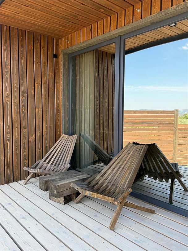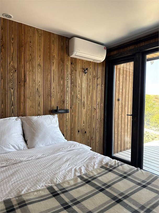 Вместительный двухкомнатный домик с новейшим стильным дизайном. В первой комнате вас ждет мини кухня со всем необходимым для приготовления завтрака обеда и ужина, а также удобный диван и журнальный столик для отдыха. Вторая комната — спальная зона с большой двухместной кроватью и выходом на террасу.