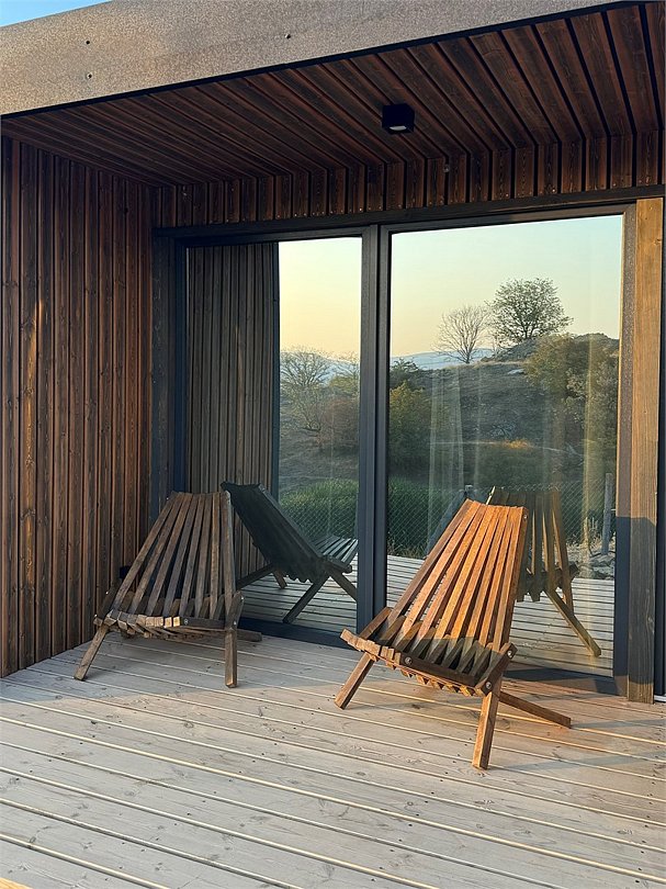 Небольшой домик с панорамным остеклением и собственной террасой.