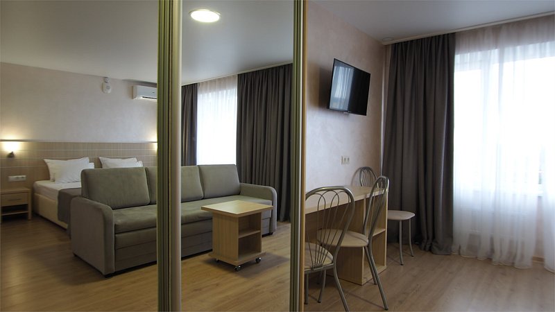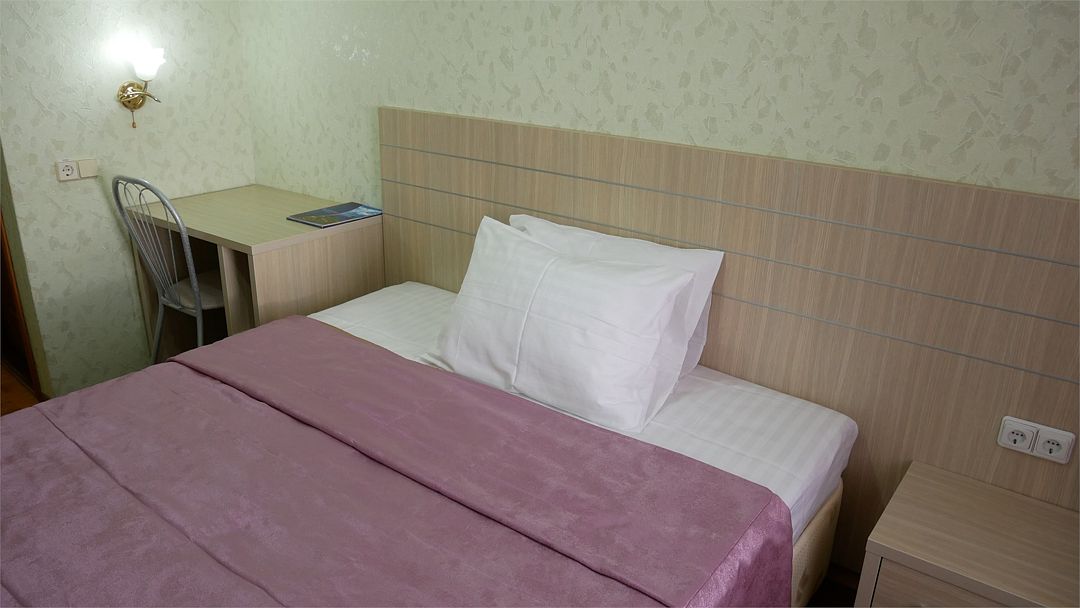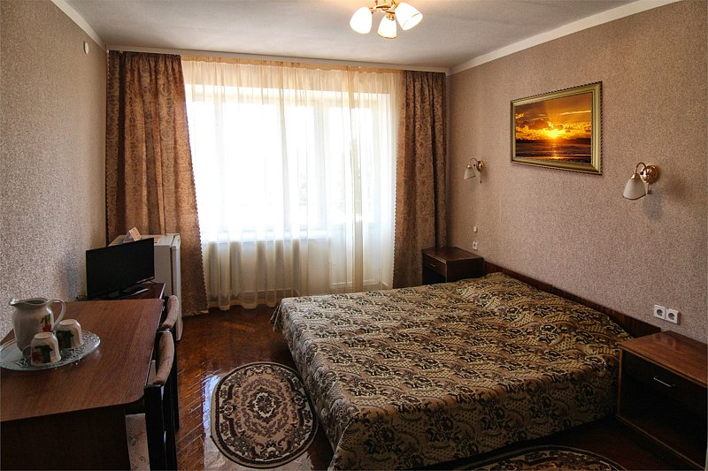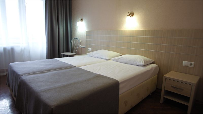 Шестиэтажный корпус оборудован двумя лифтами, для удобства подъема на этажи. В каждом номере: душ, туалет, банные принадлежности, холодильник, телевизор, балкон. Номера оборудованы кондиционерами. На этажах установлены кулеры с питьевой водой (горячей и холодной).