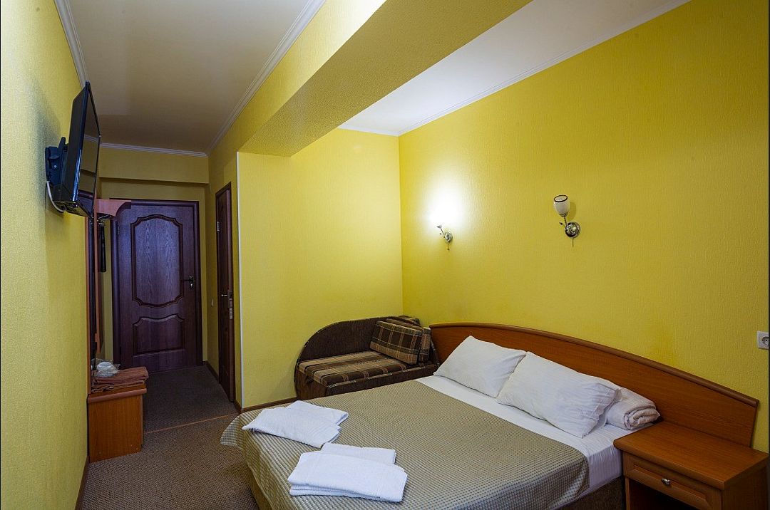 Просторный номер с балконом и видом на Медведь-гору. Или без балкона. В каждом номере кондиционер, телевизор, чайник, холодильник. Удобства в номере. Размещение на двуспальной кровати и раскладном кресле.Услуги и удобства