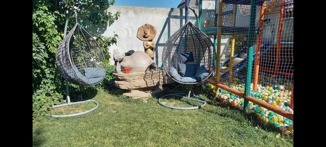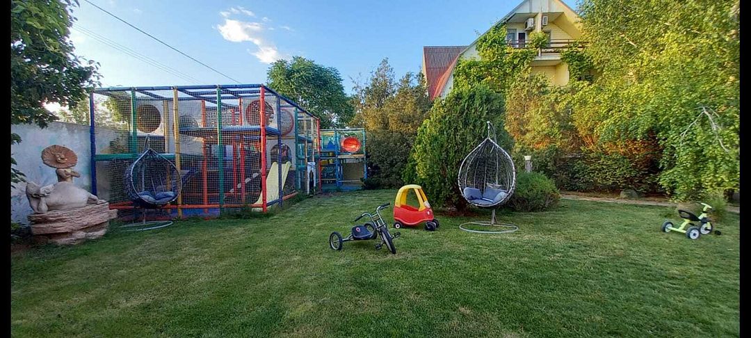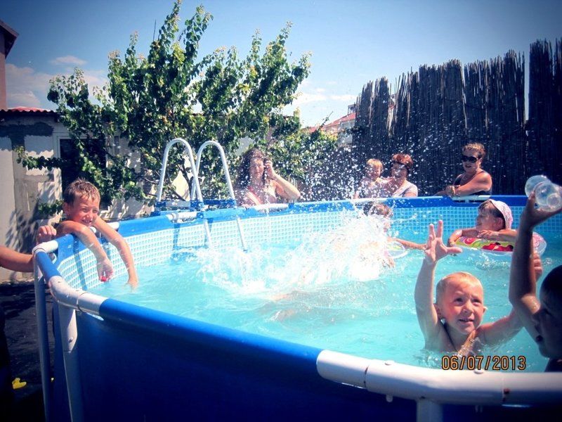На территории есть большой батут и бассейн, где родители вместе с детьми могут весело провести время.