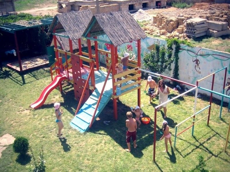 Большая детская площадка, которая придется по вкусу для всех: - для малышей есть песочница, часть которой предусмотрительно находится в тени, сказочный домик, прыгунки и качели; - для самостоятельных деток есть лазательный комплекс с лестницами, канатами и скалолазной стеной. - а для тех, кто уже вырос предусмотрены шведская стенка с брусьями, кольцами, скамейкой для упражнений, а также турники.