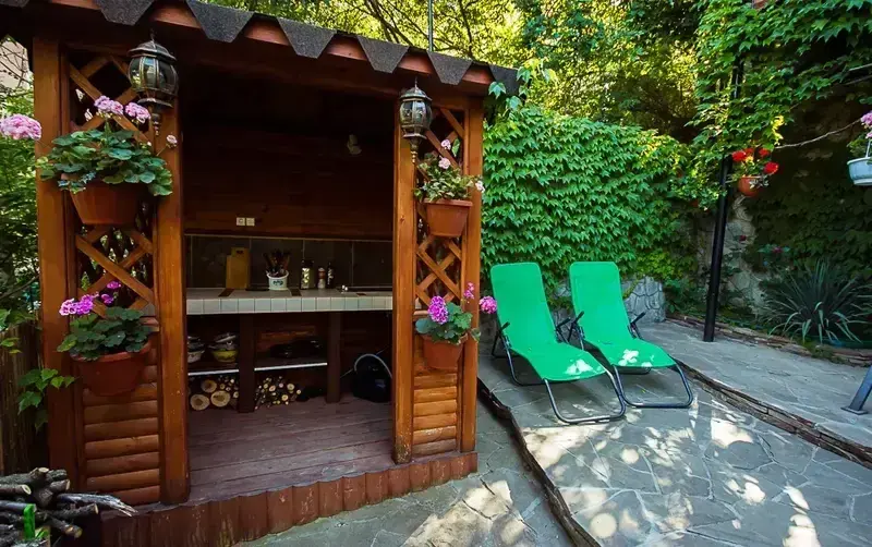 - Удобства для отдыха: качели, шезлонги, мангал для приготовления шашлыка.
