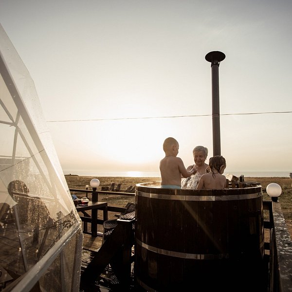 Согревающая и расслабляющая японская бочка фурако на свежем воздухе с волшебным видом на бескрайнее море. Входит в стоимость сферы, но можете забронировать дополнительную.