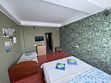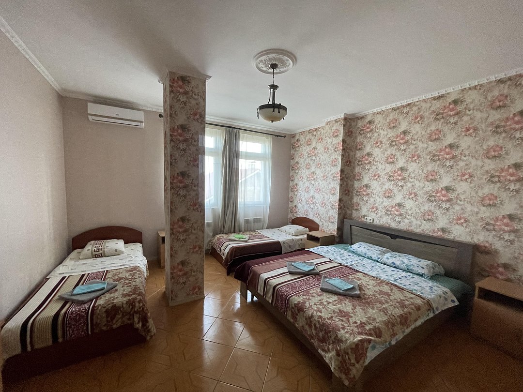 3-х местный номер оборудован всем необходимым для комфортного проживания: кровать, тумба прикроватная, шкаф, комод, стол, стулья, тв, wifi, холодильник, кондиционер и сан узел ( душ, унитаз, раковина).В номере