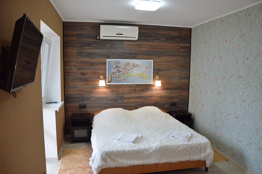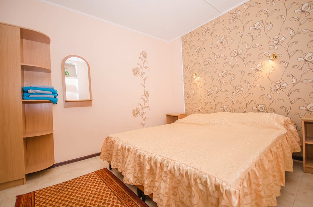 В номере: кондиционер,TV, холодильник, чайник, чашки, тарелки, ложки, столик с двумя стульями, бойлер, шкаф, 2-х местная кровать, зеркало, тумбочка, санузел в номере, сушилка для белья.