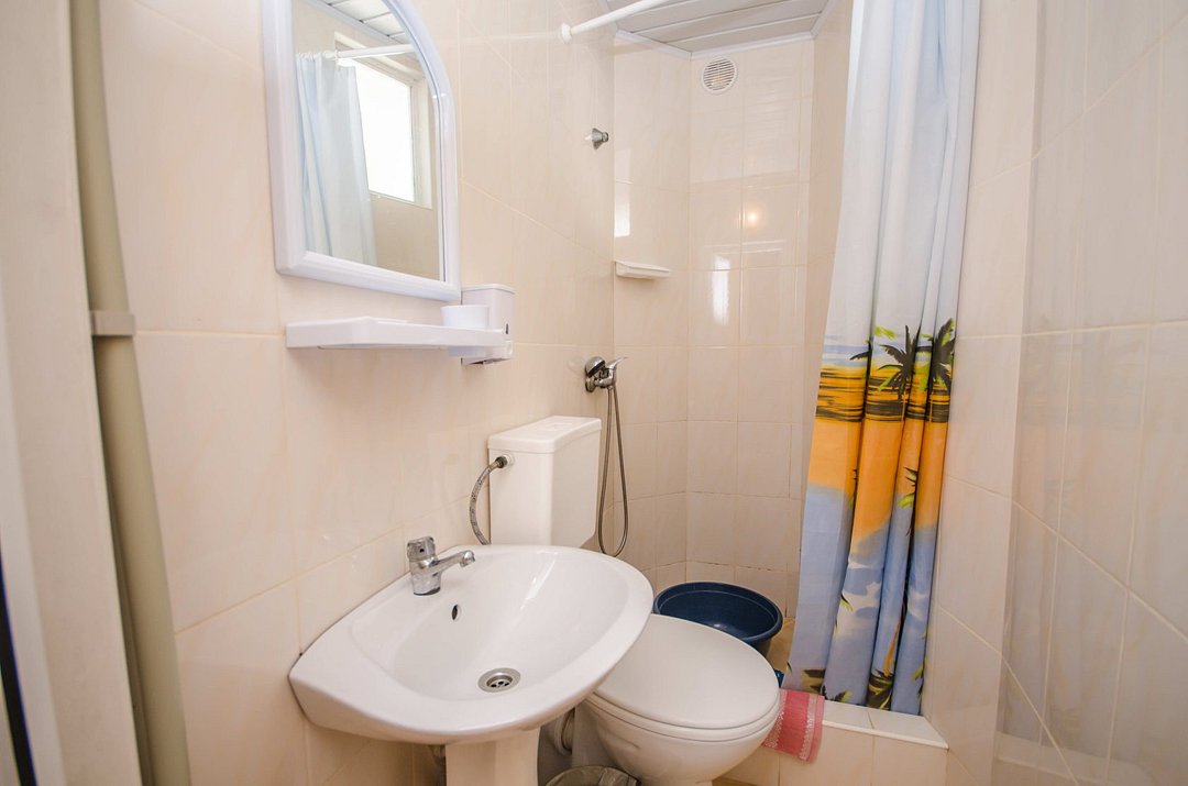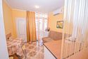 В номере: кондиционер,TV, холодильник, чайник, чашки, тарелки, ложки, столик с двумя стульями, бойлер, шкаф, 2-х местная кровать, раскладной диванчик, зеркало, тумбочка, санузел в номере, сушилка для белья.