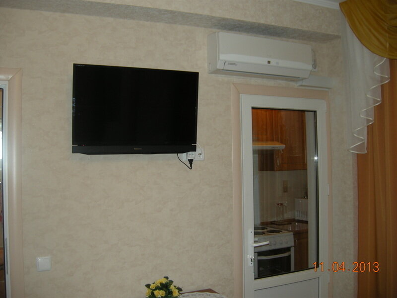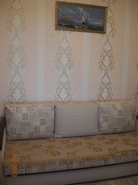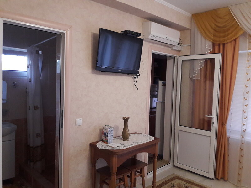 В квартире все для комфортного и отличного отдыха — бойлер, спутниковое ТВ, холодильник, стиральная машинка, утюг, посуда и мебель. Вода горячая постоянно. Во дворе все выложено кафелем. Два раздельных выхода. Во дворе столик со стульями. Один из выходов — балкончик с видом на море, где можно полюбоваться видом на море, сидя за столиком. В каждой комнате один двуспальный диван и высокий шкаф. Двор декорирован цветочным палисадником