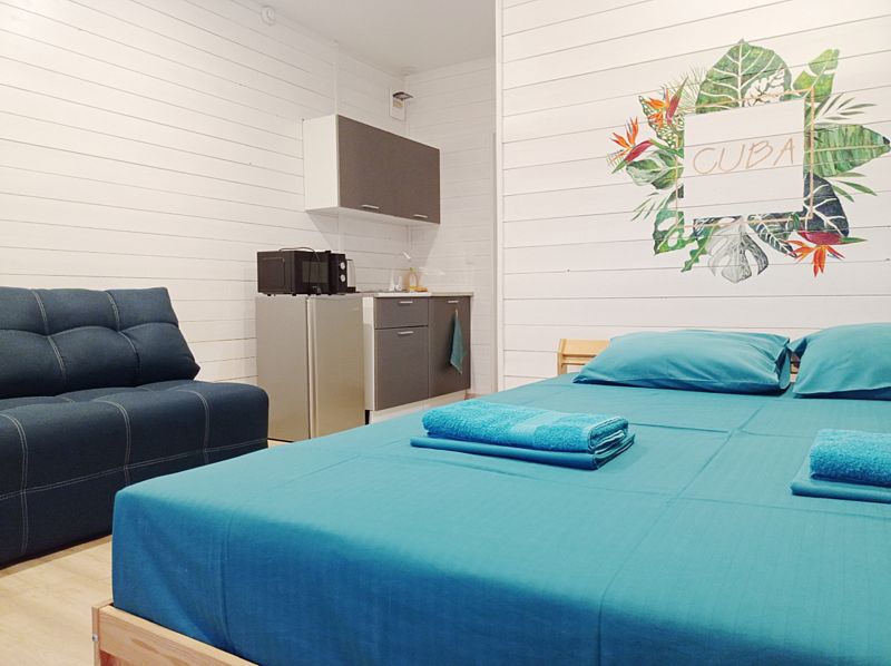 В распоряжении отдыхающих несколько комфортабельных номеров разной категории. Все студии оборудованы всем необходимым: большая двуспальная кровать с матрасом, сплит (тепло, холод), TV на андроиде, электрочайник, холодильник, микроволновая и электрическая печи, полотенца, Wi-fi. Постояльцы могут отдохнуть в свободное время, посетив оборудованный пляж и фестивальную площадку в непосредственной близости от объекта.