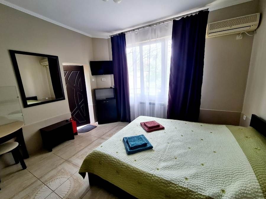 В номере: кровати односпальные, кровать двуспальная, шкаф, комод, стулья, стол, вешалка, кондиционер, Wi-Fi интернет, спутниковое ТВ, телевизор, кухонный стол, обеденный стол, СВЧ, холодильник, электрочайник, посуда, утюг, фен, санузел и душ в номере.В гостиничном номере