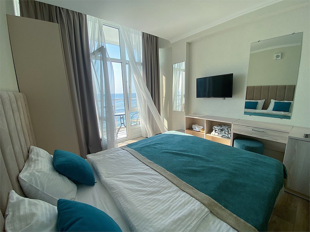 кабельное телевидение, Wi-Fi, кондиционер, светильник, душевая кабина, банные полотенца, пляжные полотенца, тапочки, двуспальная кровать, вешалки, обеденный стол, багажная тумба, зеркало, пуфики, чайный набор, набор посуды, отопление, вид на море, кулер на этаже, раздельный санузел, ламинат, стаканы, столовые приборы, тумба, туалетный столик, сушилка для белья, раскладное кресло, телевизор с плоским экраном, мини-холодильник, шкаф-купе, гостиничная парфюмерия, кресло-кроватьВ номере