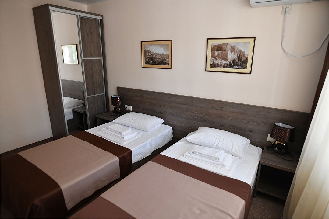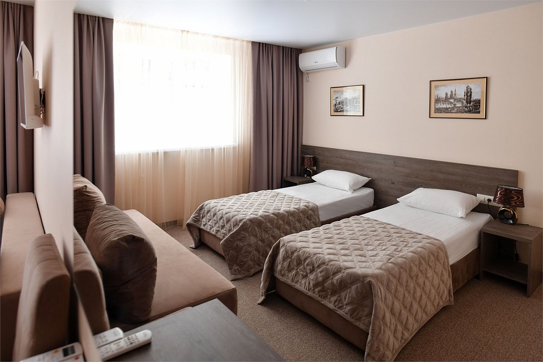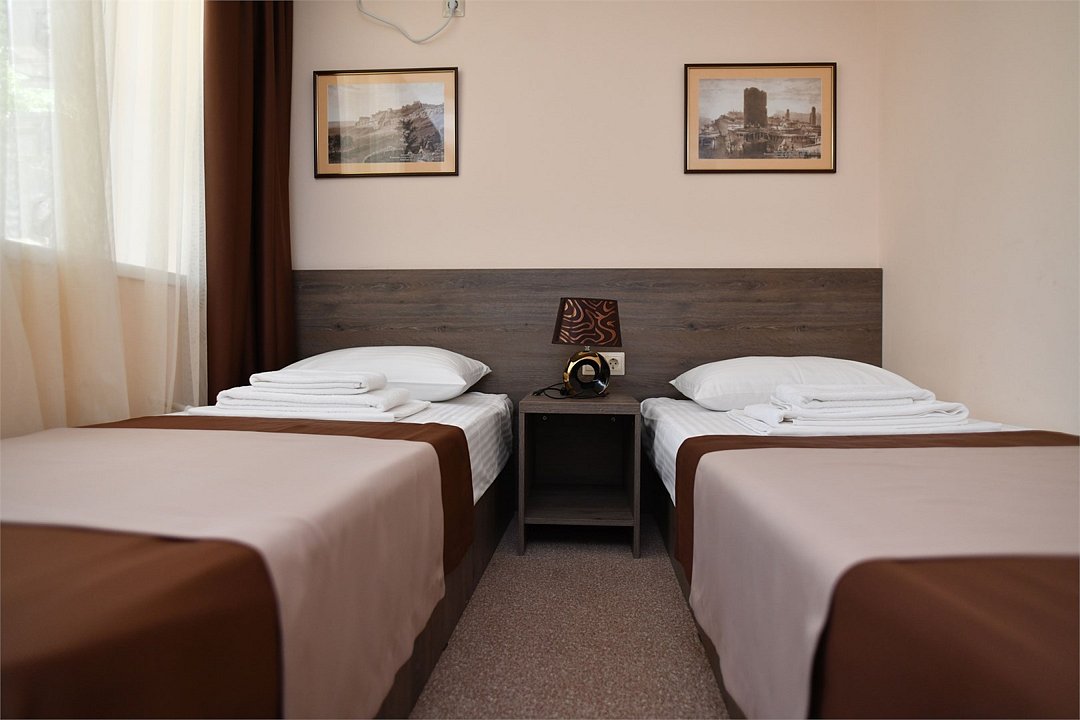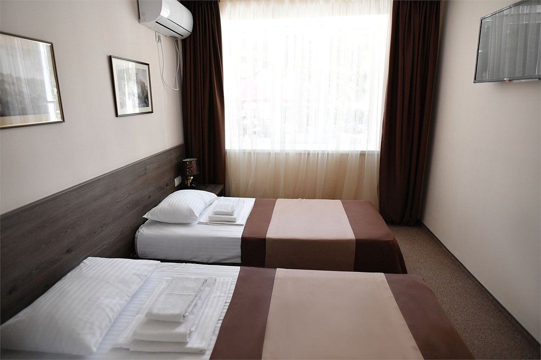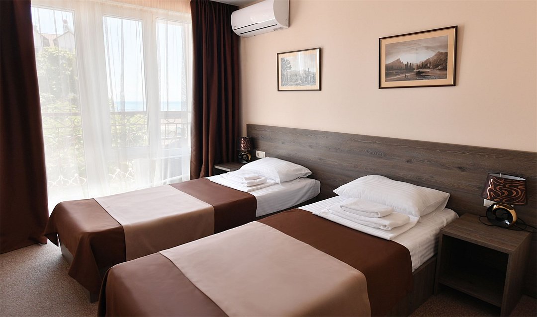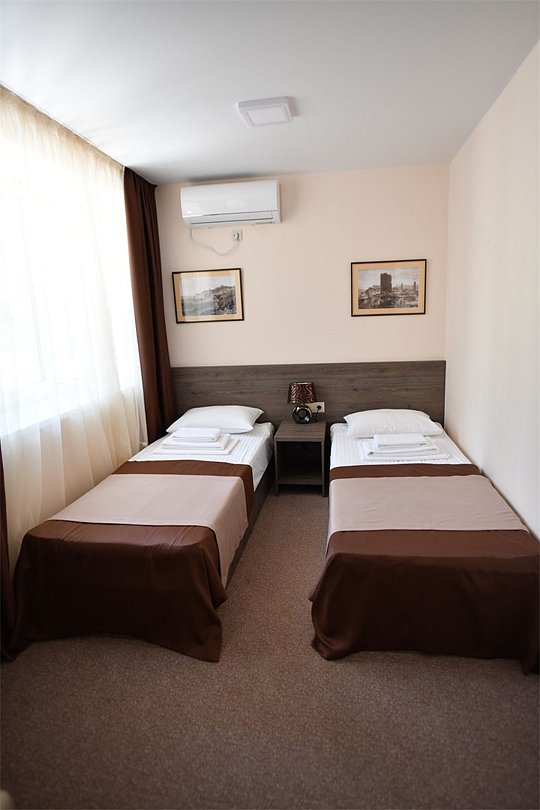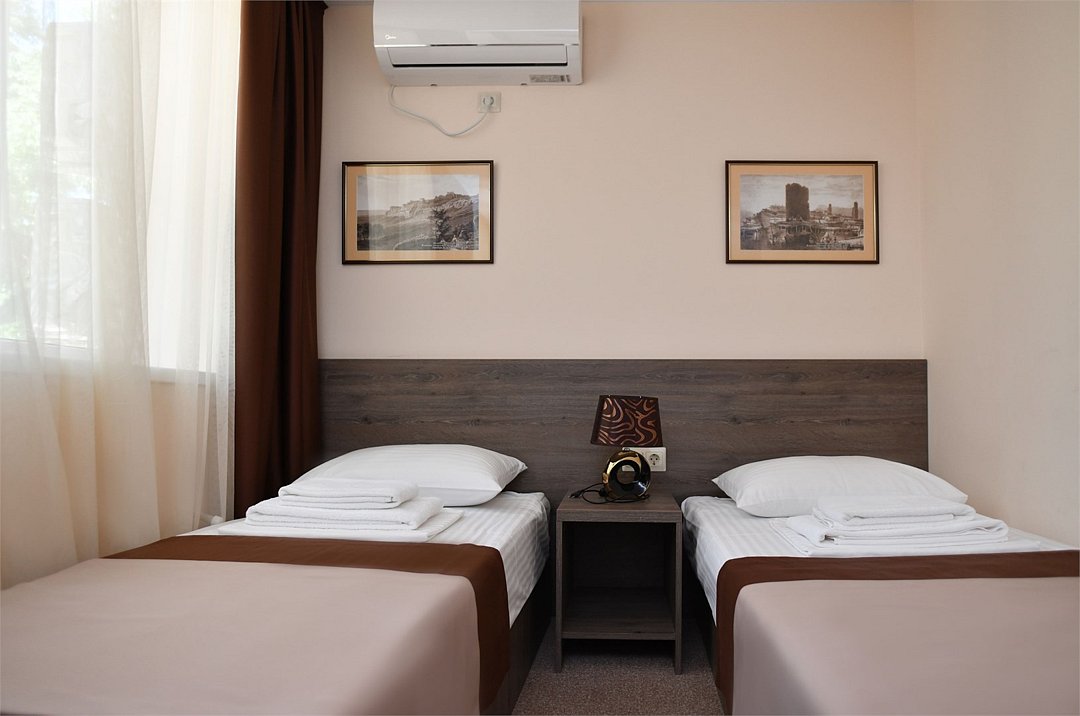 Компактный смарт номер с выходом окон на тихую территорию. При небольшой площади номер оснащён всем необходимым для комфортного отдыха. Площадь: 10-12 м2. Две 1,5 спальные кровати, прикроватные тумбы, шкаф, настольная поверхность. Санузел совмещенный, душевая кабина или поддон со шторкой, туалет, фен. Полотенца (для лица, банное, для ног), мыло, шампунь, гель, полотенцесушитель. Оборудование: телевизор, кондиционер, безлимитный Wi-Fi , барный холодильник, набор посуды (тарелка, стаканы). Покрытие – ковролин.Услуги и удобства