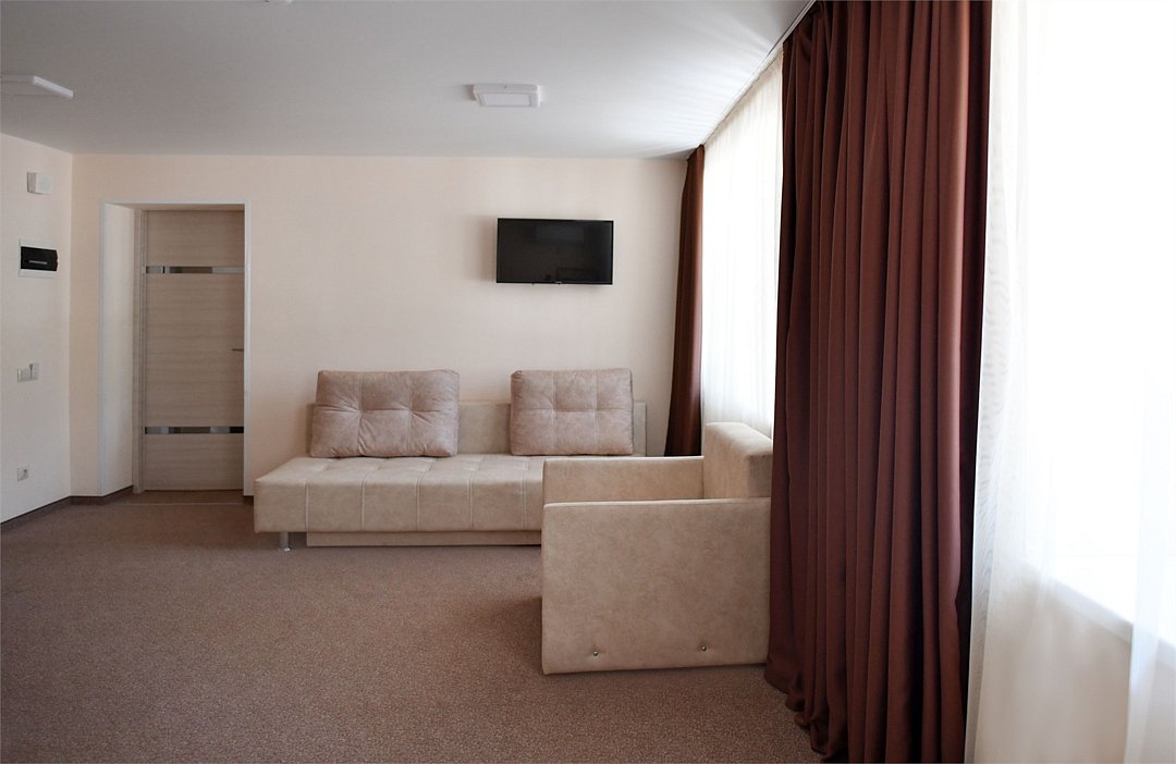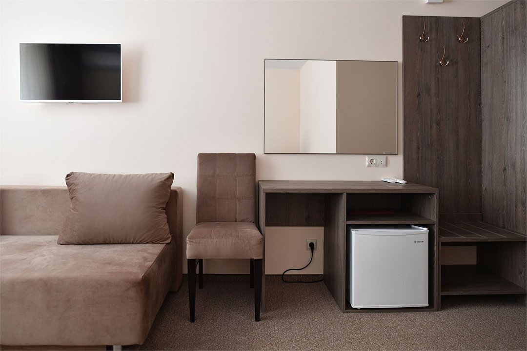 Однокомнатный современный номер с зоной отдыха и видом на тихую внутреннюю территорию пансионата Площадь: 15-18 м2 Две 1,5 спальные кровати, прикроватные тумбы, шкаф, настольная поверхность. Зона отдыха: диван или кресло Санузел совмещенный, душевая кабина или поддон со шторкой, туалет, фен. Полотенца (для лица, банное, для ног), мыло, шампунь, гель, полотенцесушитель. Оборудование: телевизор, кондиционер, безлимитный Wi-Fi , барный холодильник, набор посуды (тарелка, стаканы). Покрытие – ковролин. Этаж: 1,2,3,4Услуги и удобства