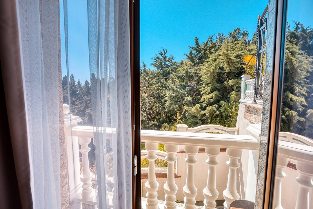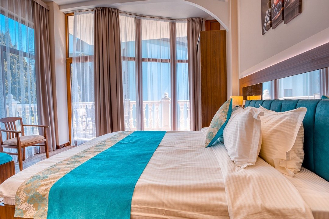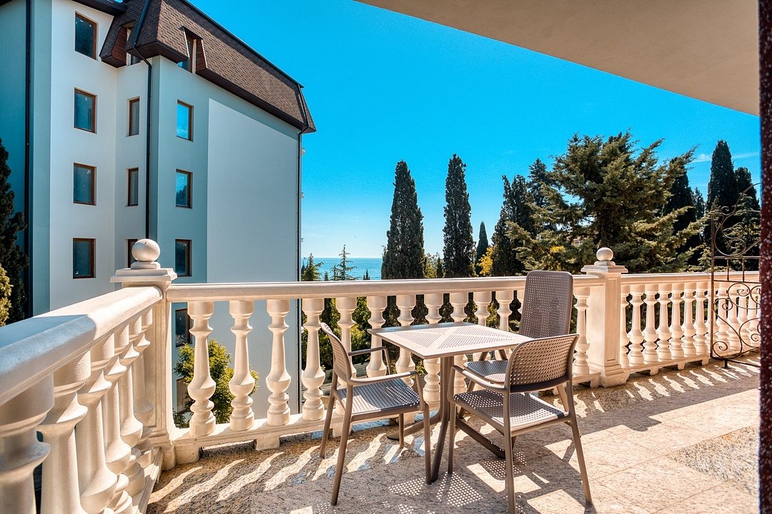 Номер с панорамным остеклением и большим балконом, с которого открывается частичный вид на море.