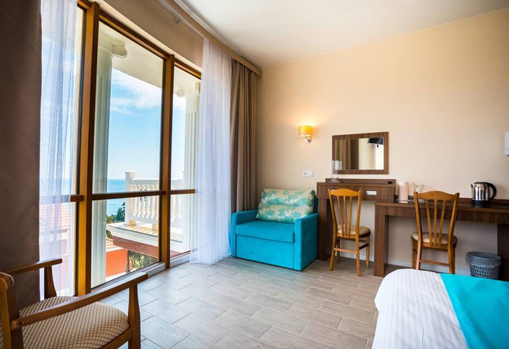 Компактный, но комфортный номер с небольшим балконом и частичным видом на море.