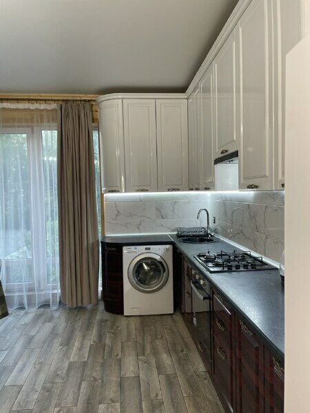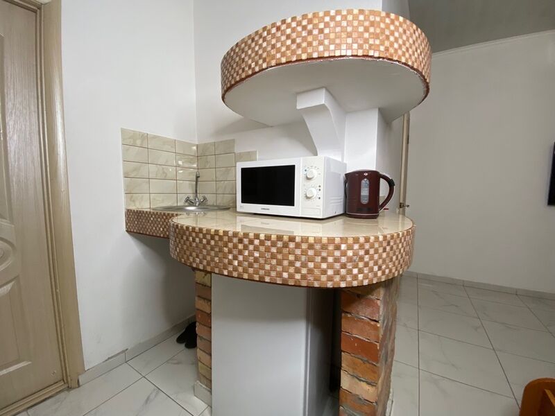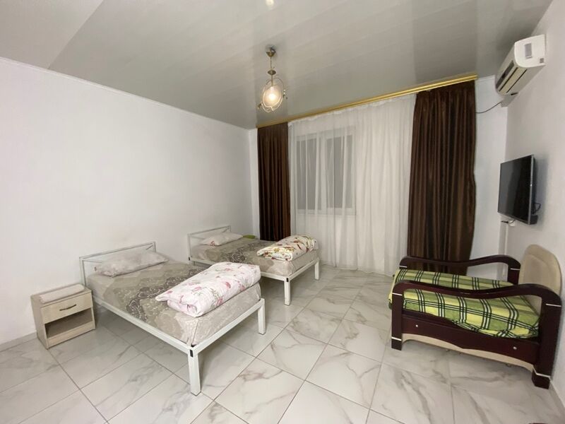 Кровати односпальные (2) или двуспальная (1). В номере: кухонный уголок с мойкой, вытяжкой, холодильником и СВЧ-печью, стол, стул, телевизор, диван, кондиционер, шкаф, санузел с душем и зеркалом