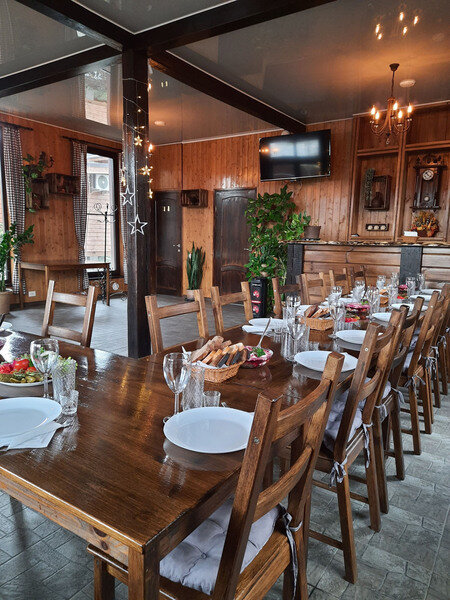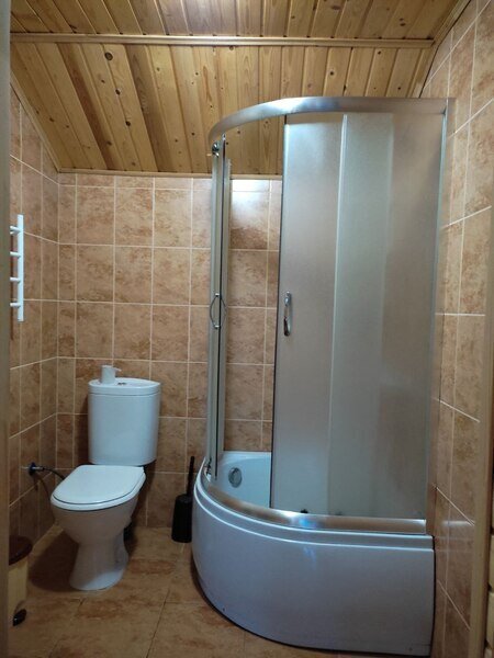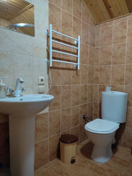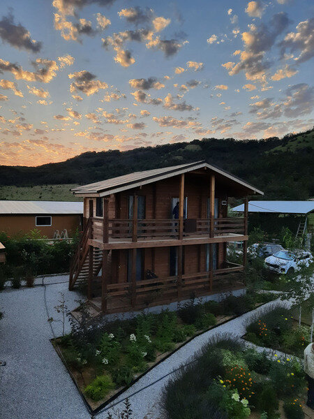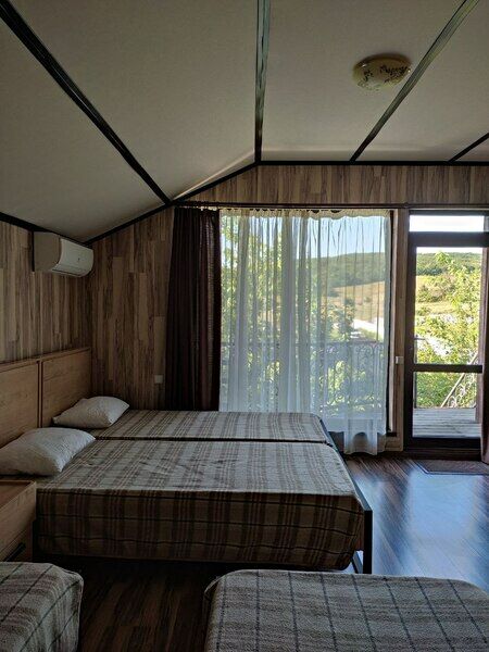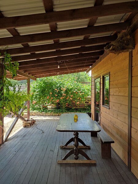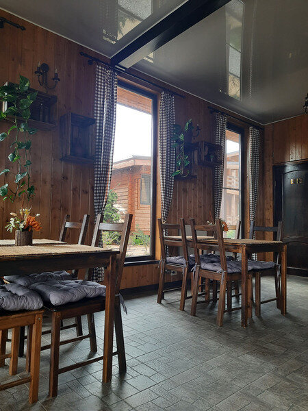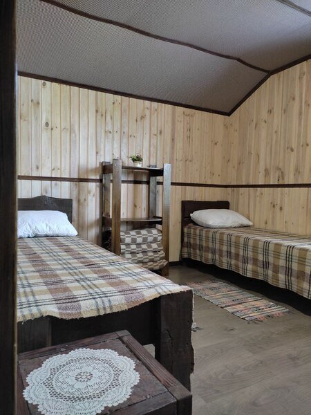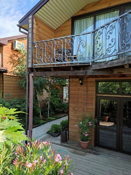 Деревянный гостевой двухэтажный домик на 6 спальных мест (возможны доп. спальные места). На первом этаже уютная большая комната, в которой есть все необходимое для отдыха семьей или большой дружной компанией друзей (холодильник, микроволновая печь, большой стол, музыкальный центр, ТV). Так же на первом этаже баня на дровах, бассейн с родниковой водой, санузел (горячая вода круглые сутки).