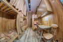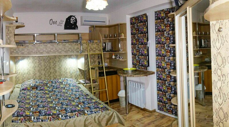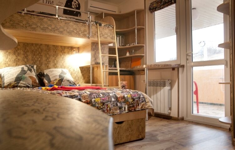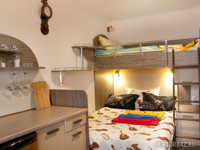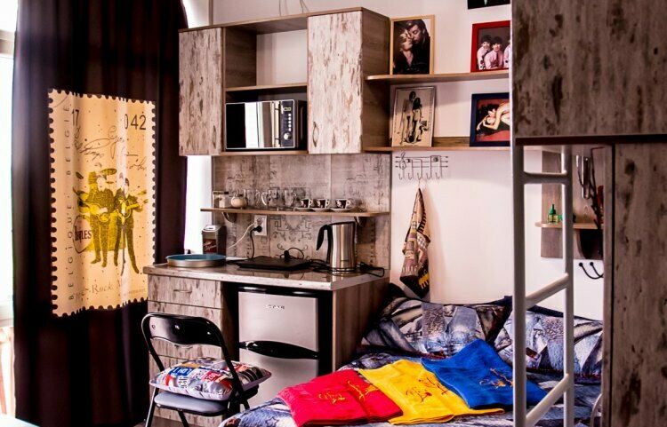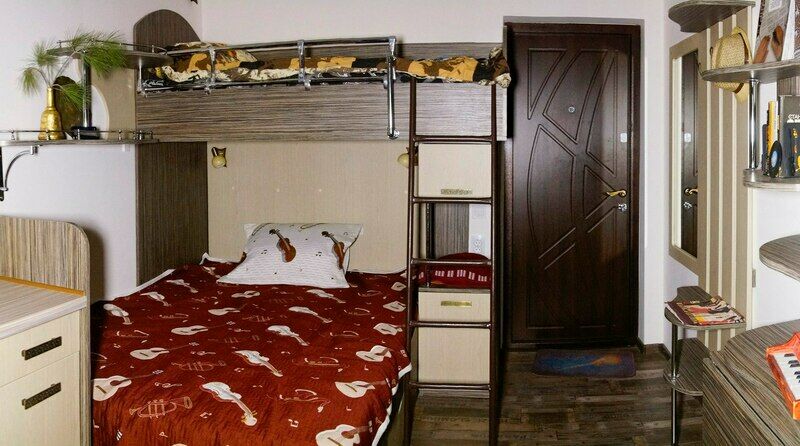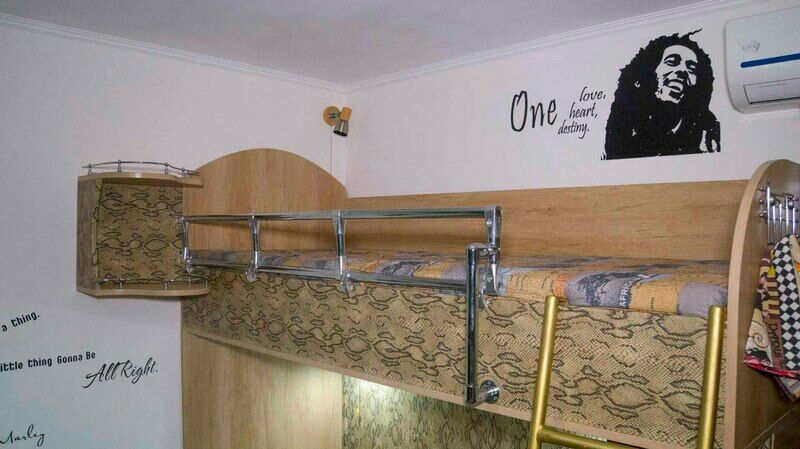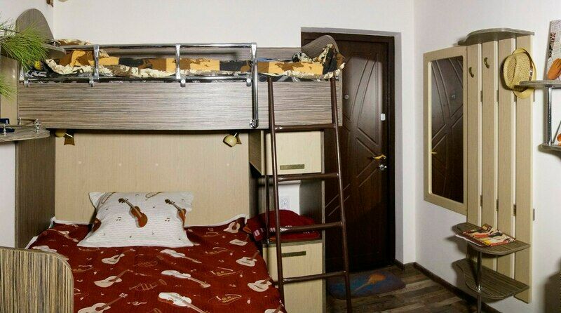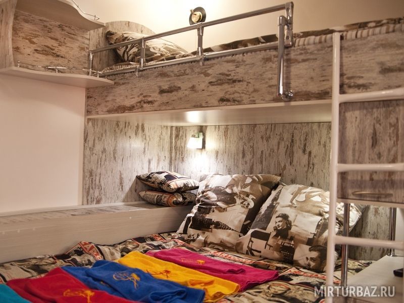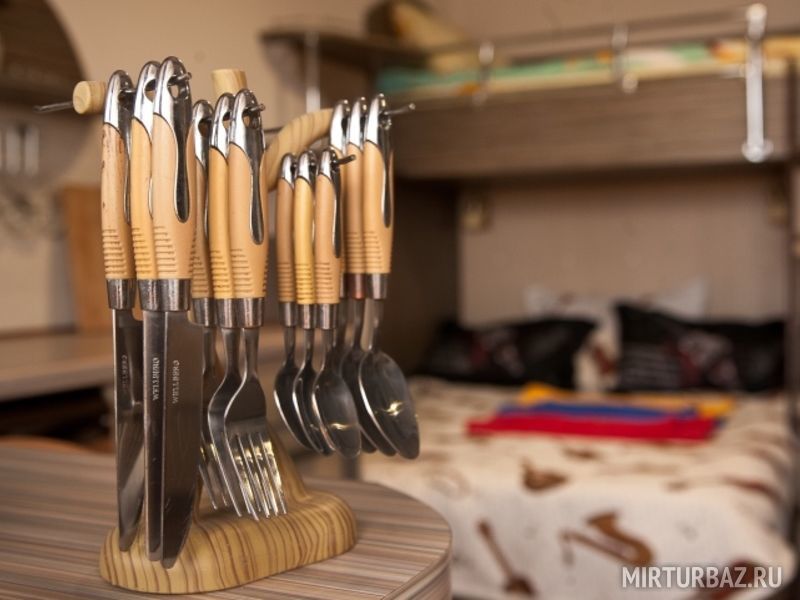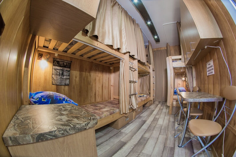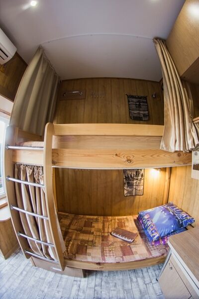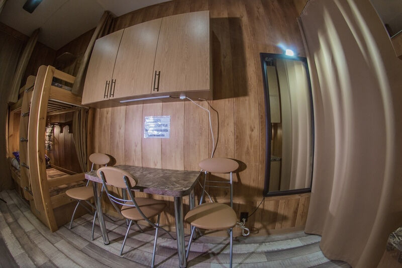 "Русский рок". Эконом-купе 6-ти местное. (15 кв.м.) 3 двуярусные кровати, кондиционер, замыкающиеся шкафчики для каждого спального места, шторки "блэк аут" вокруг кроватей и на окнах, у каждой кровати личные вешалки, плечики, полочка, светильник и розетка для зарядки смартфона в изголовии кровати. Вход в комнату с улицы. С/у на территории. Общая кухня для приготовления пищи. Здесь проживало множество рок-героев российской сцены