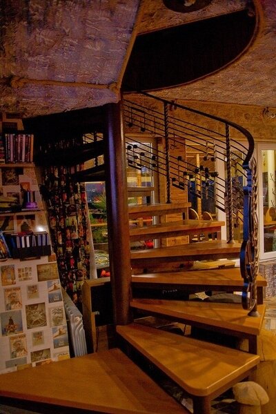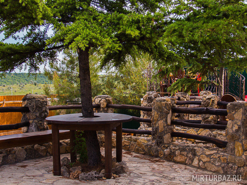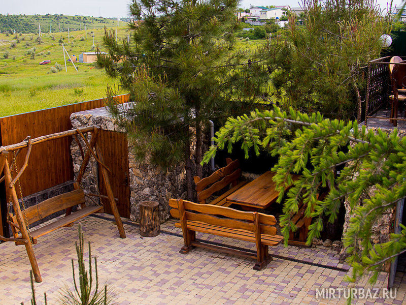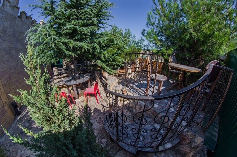 На территории гостевого дома Hotel California расположено два здания, одно трёх этажное с номерами и кафе, баней, джакузи, второе выполнено в виде крепости и само по себе радует глаз. Крепостные часы всегда подскажут вам который сейчас час. В лицевой части крепости расположена сцена 26 м², оборудованная световой и звуковой техникой для проведения концертов или совместных джемов по желанию.