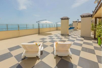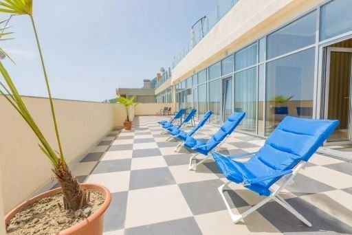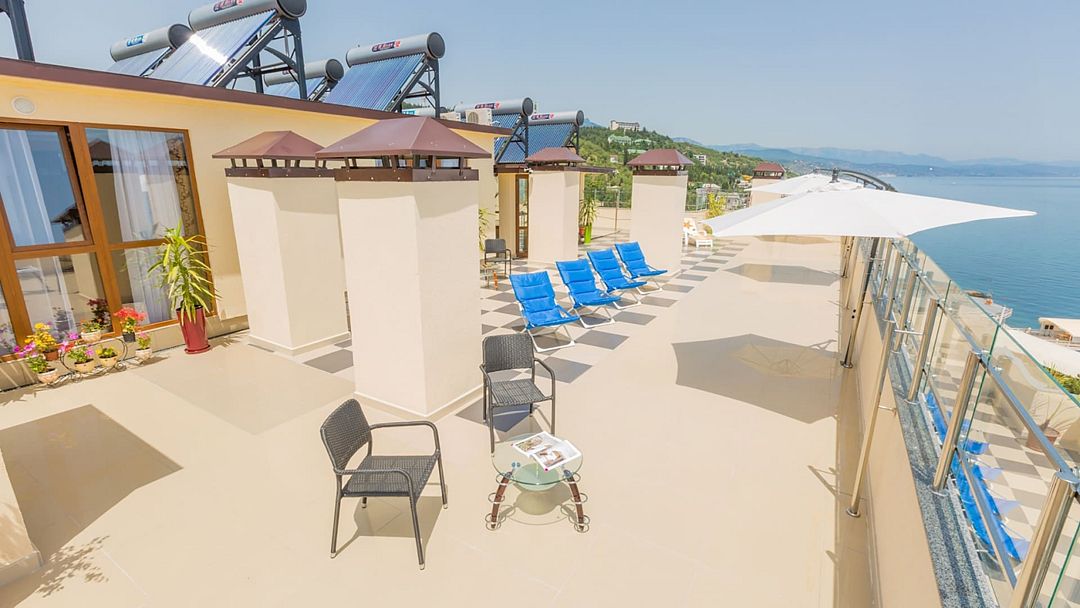 На крыше отеля расположена просторная терраса с видом на море, идеально подходящая для загара.