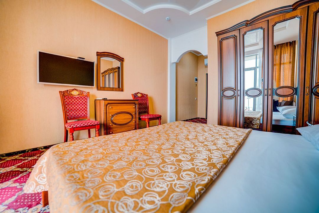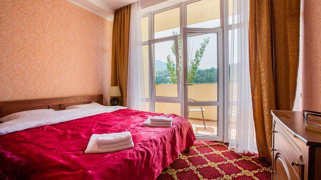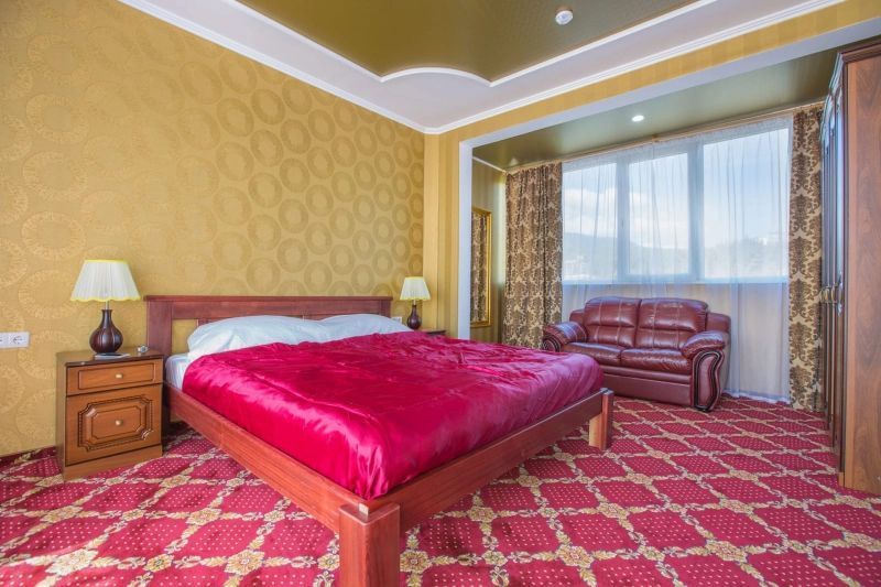 Двухкомнатный просторный номер с балконом площадью 45 м2. Расположен на 6-м этаже отеля с завораживающим видом на горы. Каждый номер оснащен мебелью из натурального дерева.