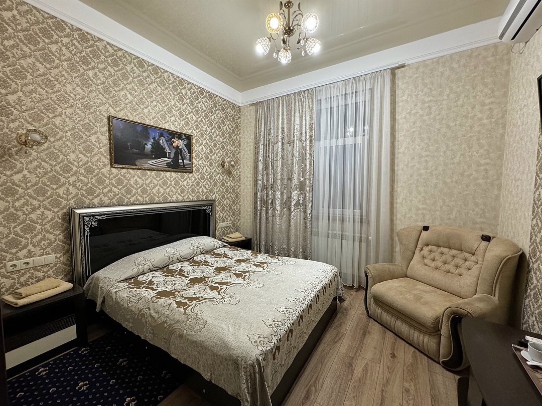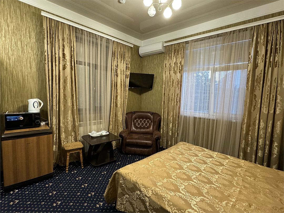 телевизор, спутниковое телевидение, Wi-Fi, интернет, холодильник, кондиционер, ванная комната, тапочки, гигиенические средства, двуспальная кровать, тумбы, вешалки, журнальный столик, зеркало, набор посуды, обслуживание номеров, чайник, мягкая мебель, питьевая вода, ковровое покрытие, отопление, кресло, вид во двор, высокие потолки, стаканы, столовые приборы, раскладное кресло, москитная сетка, шкаф-купе, номер для некурящихВ гостиничном номере