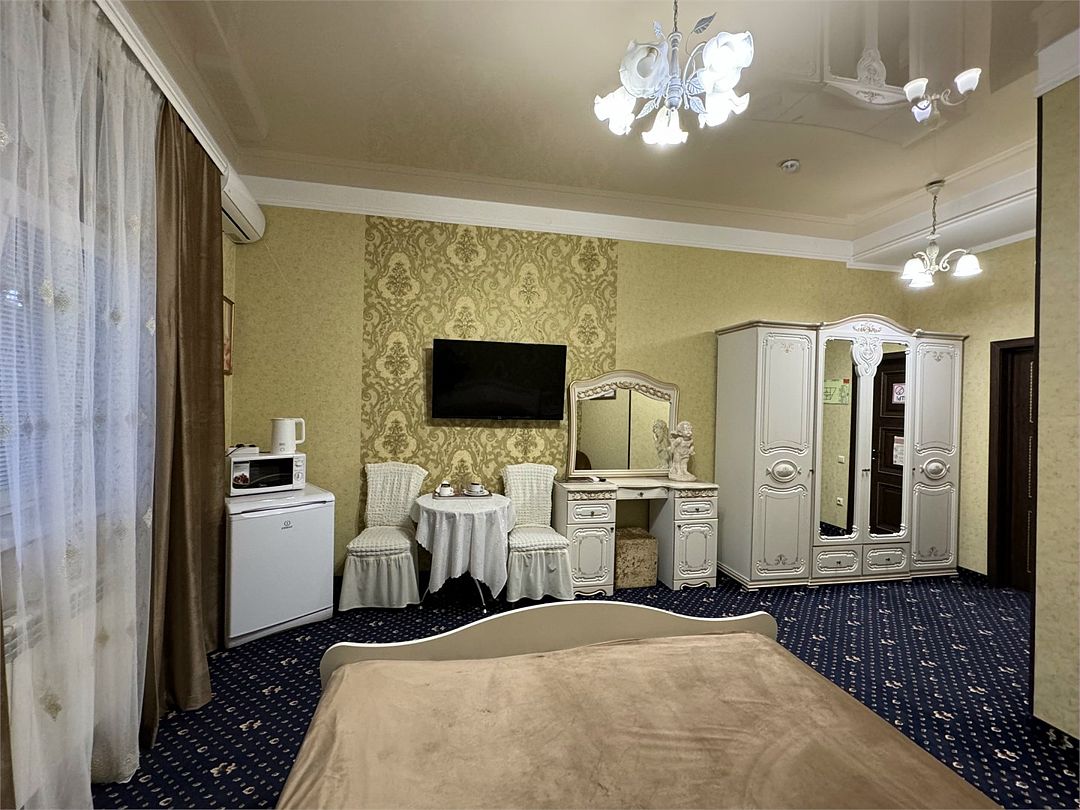 кабельное телевидение, Wi-Fi, интернет, холодильник, кондиционер, светильник, фен, система безопасности, микроволновая печь, утюг, обогреватель, санузел, халаты, банные полотенца, тапочки, кровать «King size», стулья, шкаф для одежды, вешалки, обеденный стол, зеркало, пуфики, набор посуды, обслуживание номеров, чайник, унитаз, раковина, питьевая вода, ковровое покрытие, отопление, душ, кулер на этаже, плиточное покрытие, вид во двор, высокие потолки, стаканы, столовые приборы, туалетный столик, туалетный столик, туалетные средства, туалет, телевизор с плоским экраном, москитная сетка, шкаф-купе, номер для некурящихВ гостиничном номере