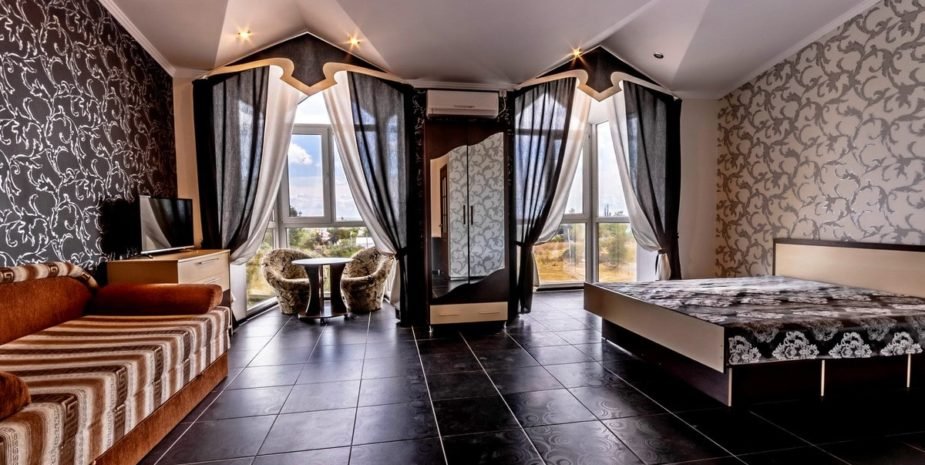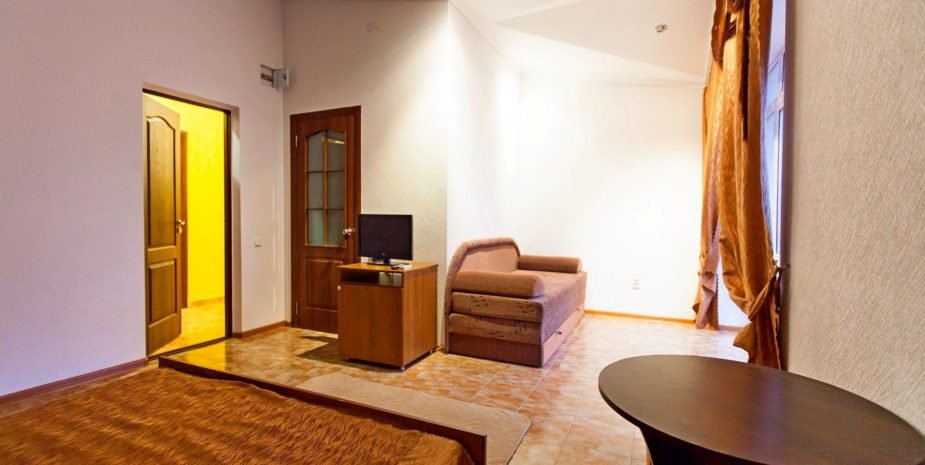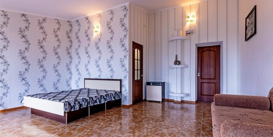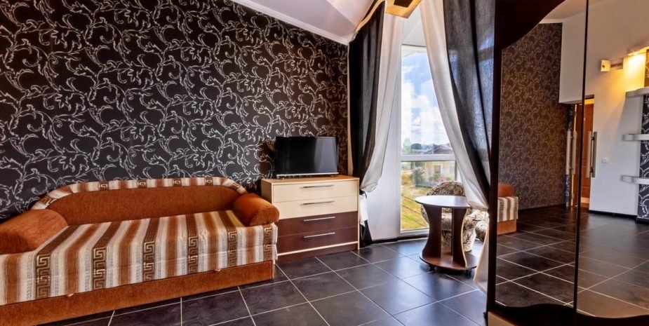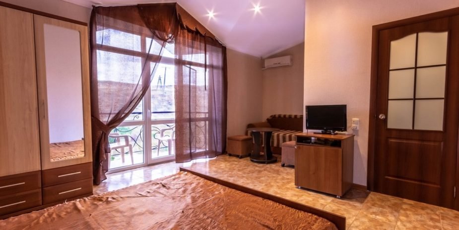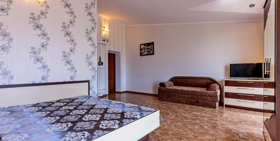 Позвольте познакомить вас с нашим уютным номером люкс «Джуниор». Это однокомнатный номер с современным и продуманным интерьером, где каждая деталь создана для вашего удобства. Площадь номера — 18 кв. м, а вместимость — от 3 до 4 человек. Здесь вы найдёте всё необходимое для беззаботного отдыха: удобную двуспальную кровать; мягкий диван для отдыха; платяной шкаф с зеркалом; кондиционер для комфортной температуры в любой сезон; холодильники телевизор со спутниковым ТВ; санузел с душевой кабиной (всегда есть горячая и холодная вода), туалетом и умывальником; бесплатный Wi‑Fi.