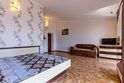 Двуспальная кровать, платяной шкаф с зеркалом, кондиционер, тумбочки, холодильник, телевизор (спутниковое телевидение), двуспальный диван, санузел (душевая кабина с постоянной холодной и горячей фильтрованной водой, туалет, умывальник), интернет. Номера идут с видом на бассейн.