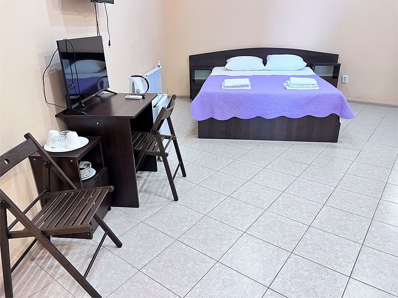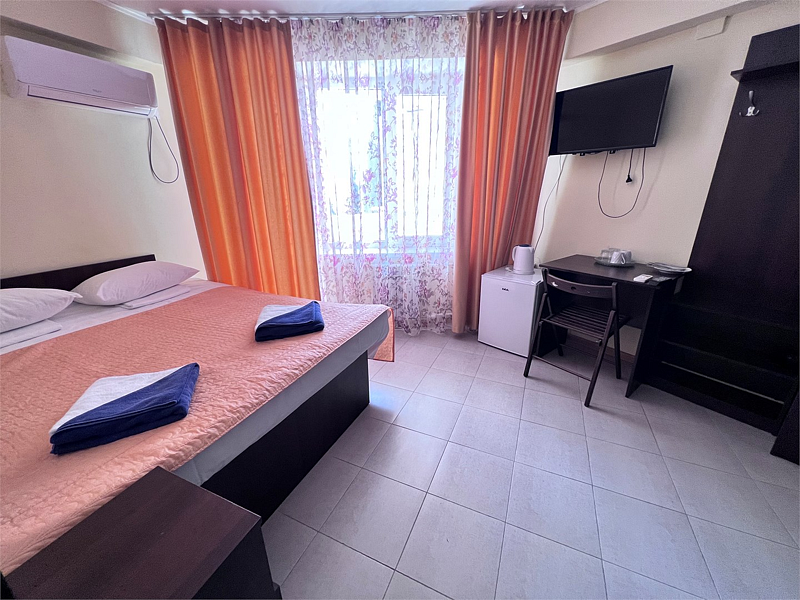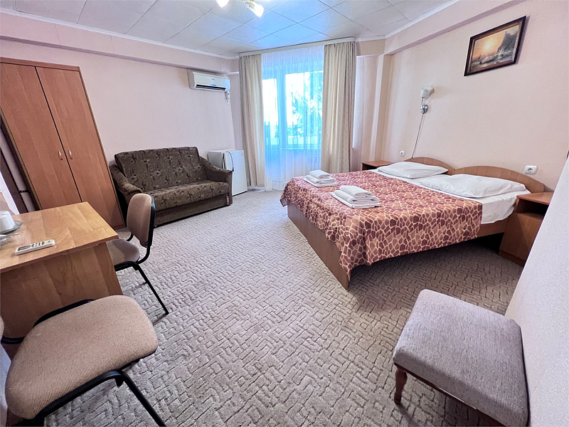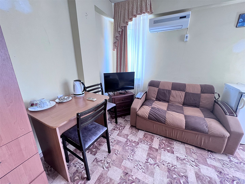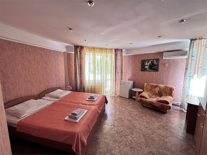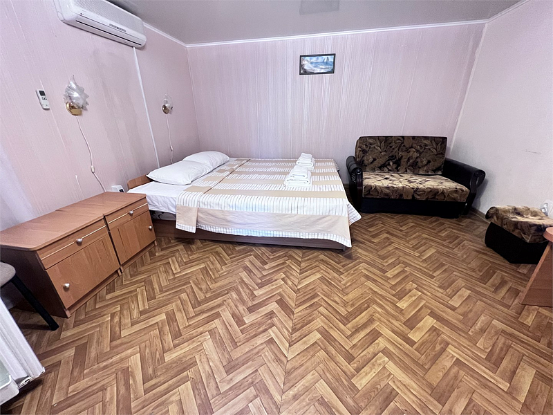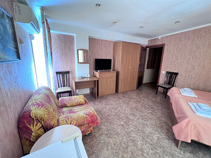 Однокомнатные номера расположены в Третьем корпусе пансионата на первой береговой линии возле пляжа «Министерский». 1-комнатный 2-местный номер со всеми удобствами.