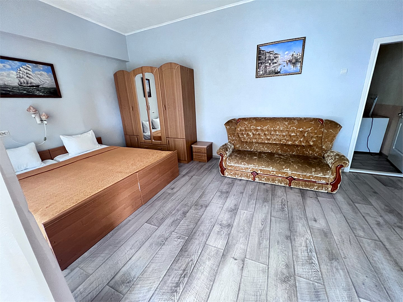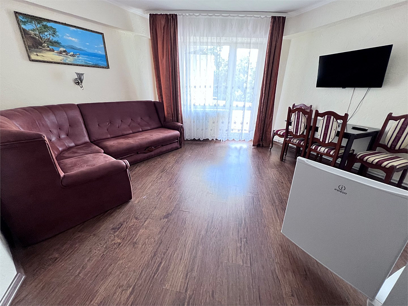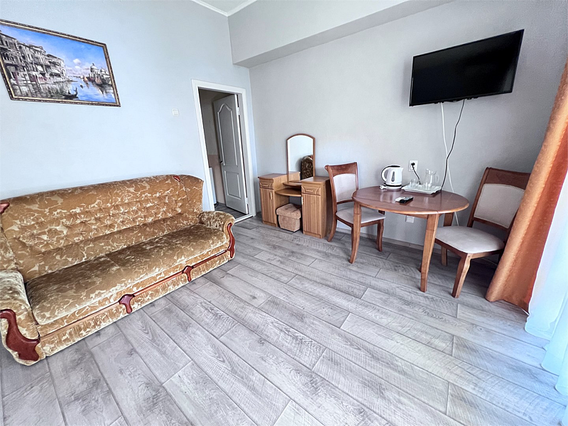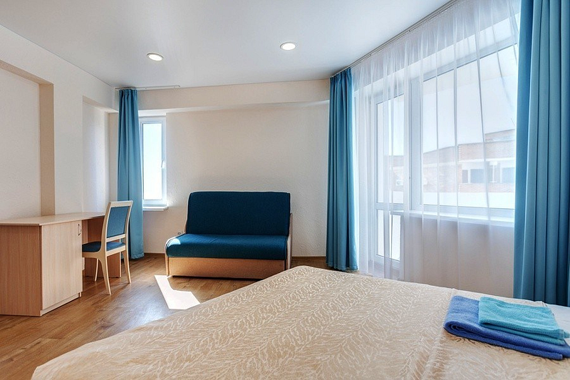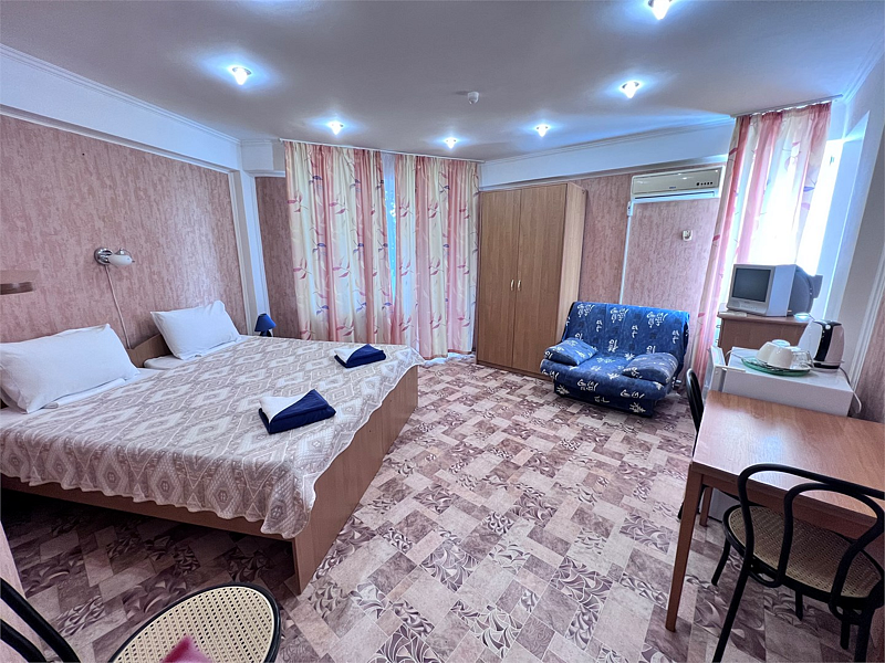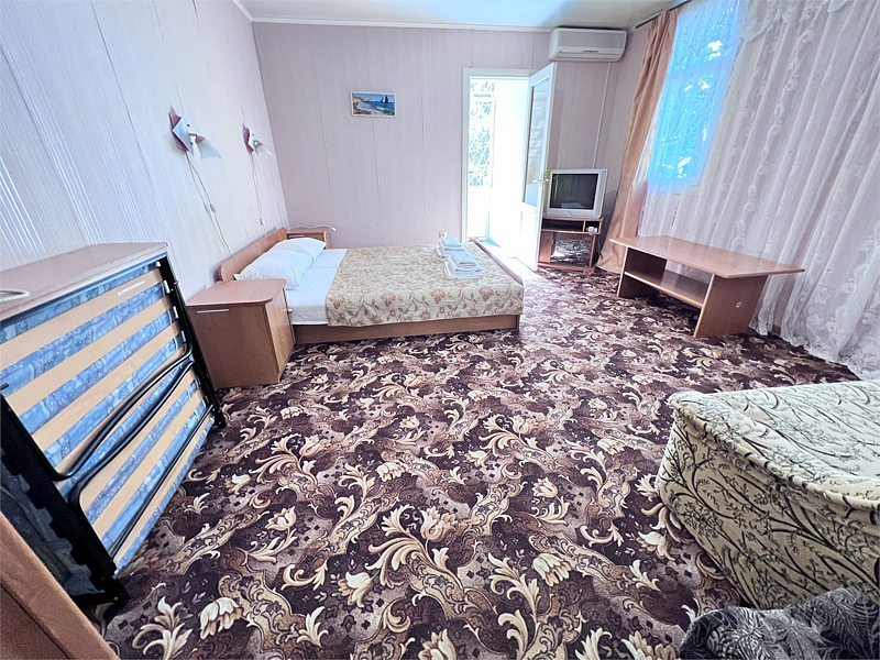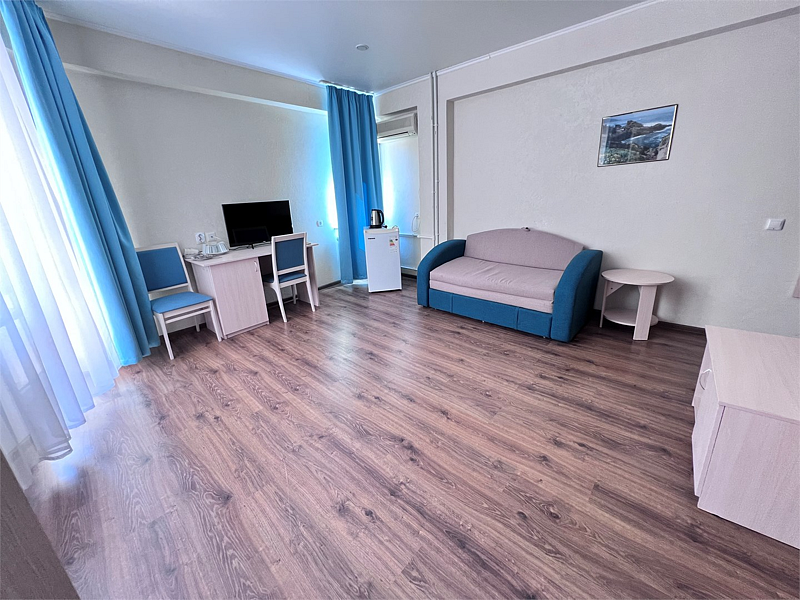 В номере две кровати типа «коннект» (можно сдвигать), раскладной односпальный диван, телевизор, холодильник, кондиционер, прикроватные тумбочки, платяной шкаф, комод, стол, стулья, ламинат, полный санузел (туалет, умывальник, душ). Балкон с видом на море.