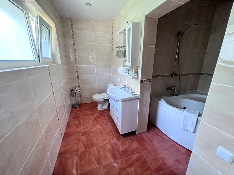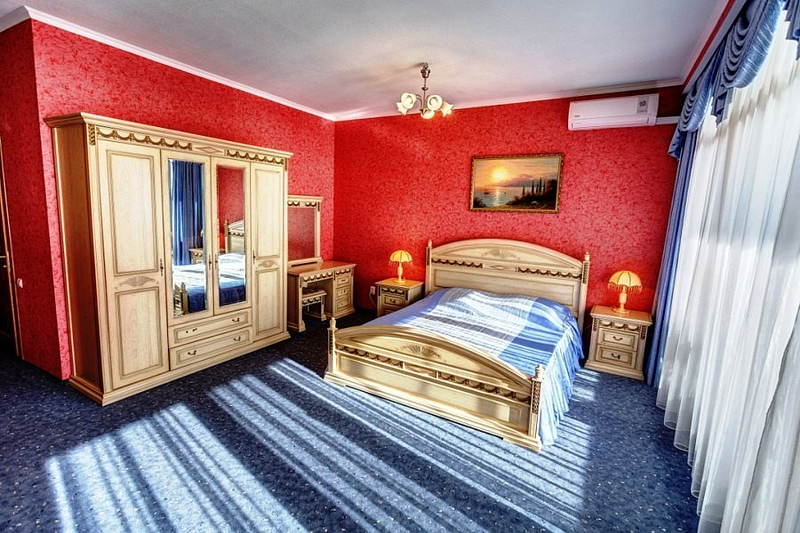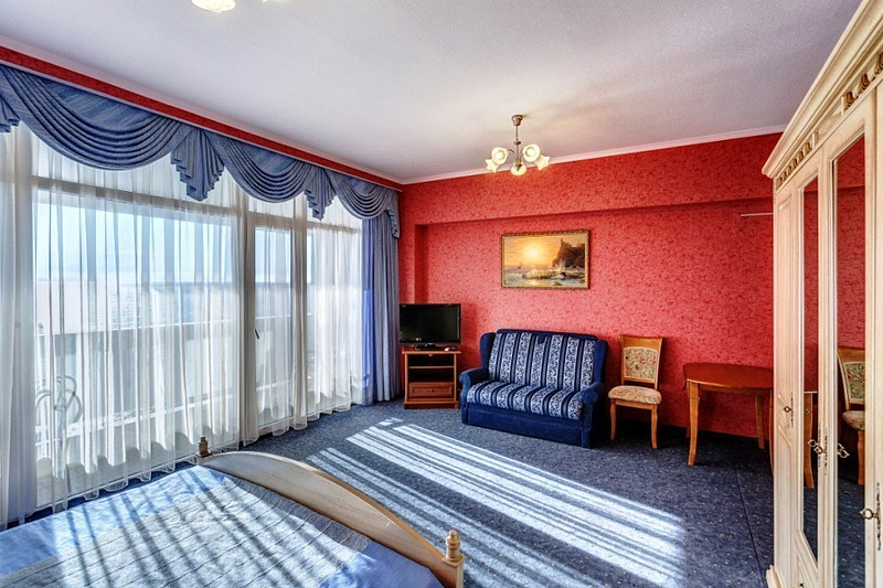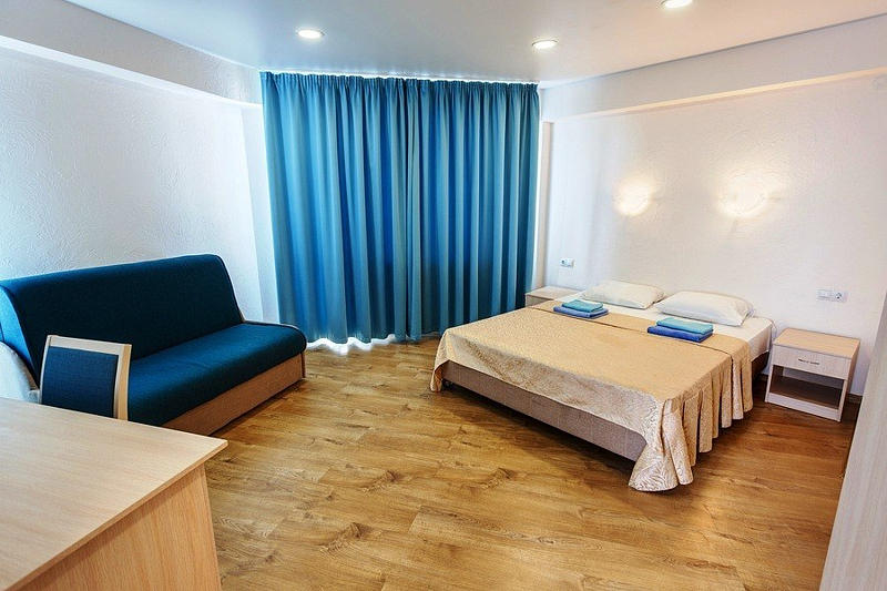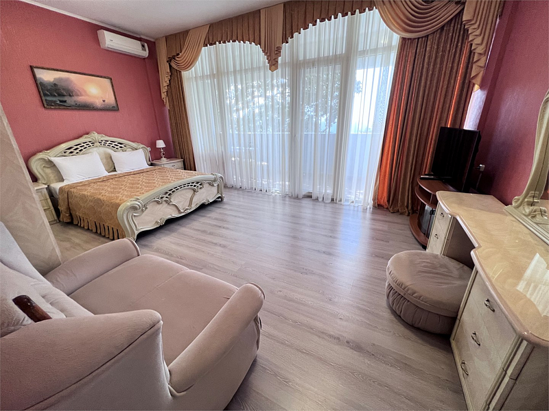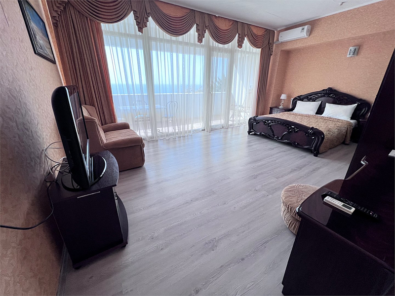 В номере двуспальная кровать, раскладной односпальный диван, телевизор, холодильник, кондиционер, прикроватные тумбочки, платяной шкаф, стол, стулья, паркет, санузел (туалет, умывальник, душ). Балкон с видом на море или на горы.