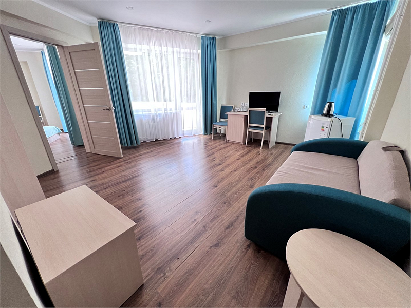Двухкомнатный номер расположен в самом большом корпусе пансионата, рядом с пляжем «Министерский».