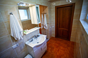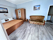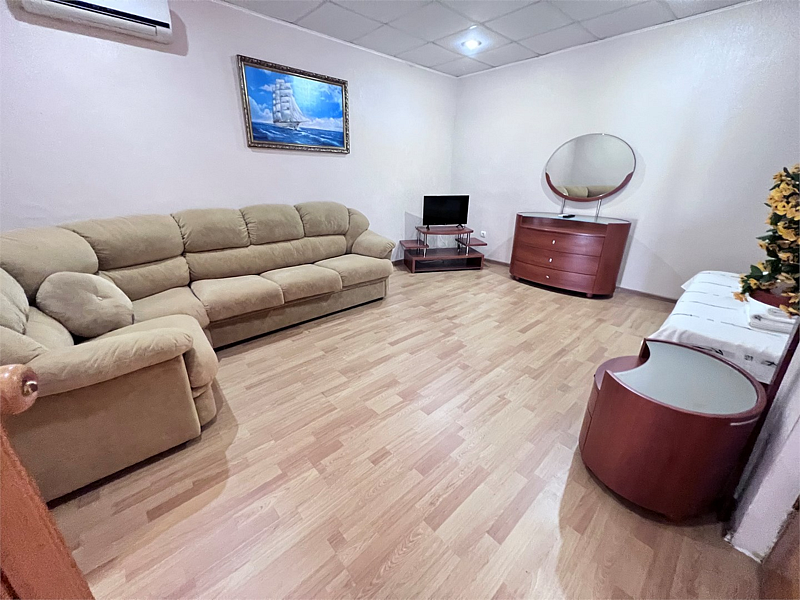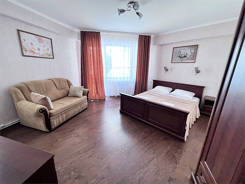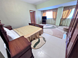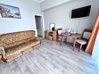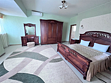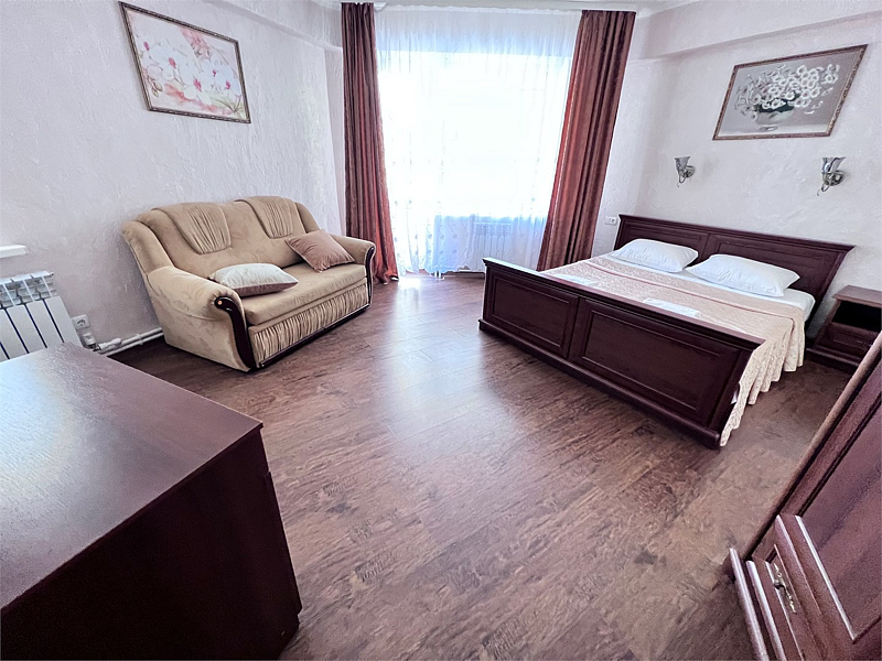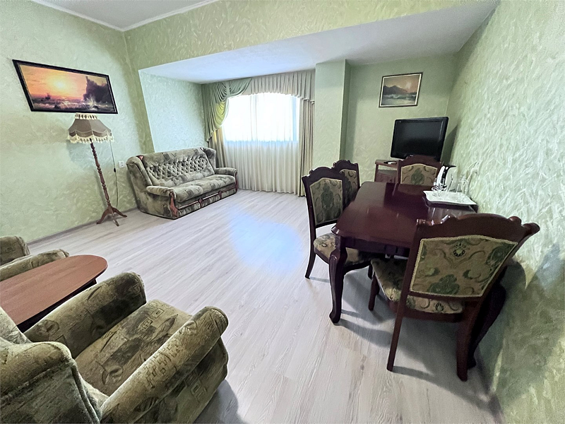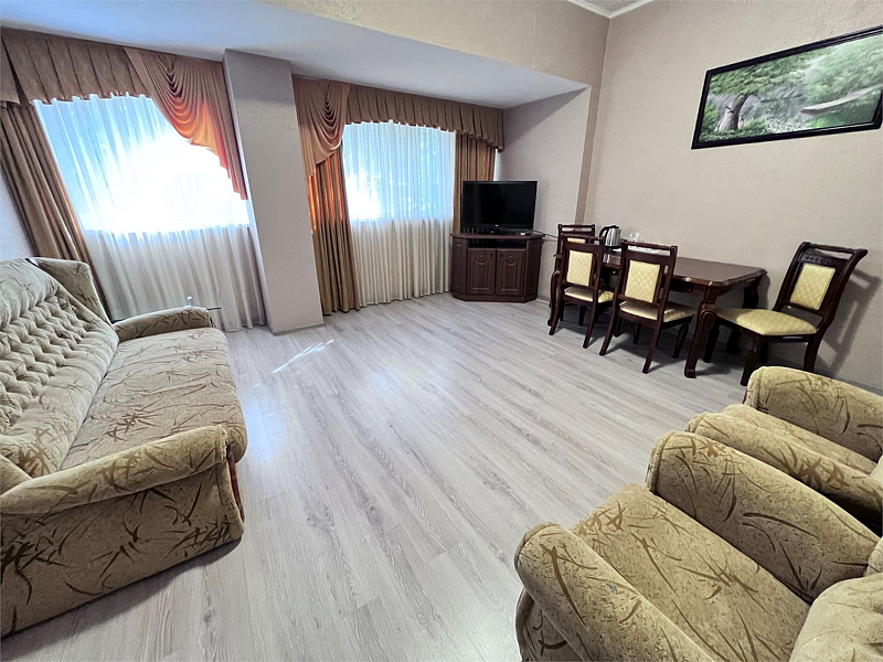 В номере двуспальная кровать, раскладной односпальный диван, телевизор, холодильник, кондиционер, прикроватные тумбочки, платяной шкаф, стол, стулья, санузел (туалет, умывальник, душ), ламинат.