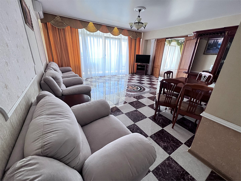 Номер состоит из двух спален (1 спальня — двуспальная кровать, прикроватные тумбочки, платяной шкаф, комод, кондиционер; 2 спальня — двуспальная кровать, диван, прикроватные тумбочки, платяной шкаф, кондиционер) и гостиной (раскладной диван, кресла, телевизор, холодильник, кондиционер, обеденный стол, стулья) с кухонной зоной (барная стойка с посудой, микроволновая печь, электрочайник), плиточное покрытие, два санузла. Лоджия с видом на море. Номер для некурящих.