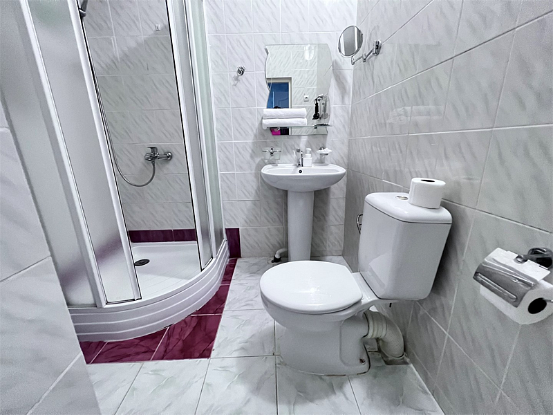 Номера чистые, белье белое чистое, диваны, кровати нормального качества, спать удобно, есть шкаф, кондиционер, холодильник,балкон с шикарными видами. Санузел совмещен, обычный душ (все целое, рабочее) и чистый унитаз. Есть туалетная бумага, наборы для душа гель и шампунь. Нет тапочек одноразовых. Телевизор старенький, маленький, но мы его даже не включали)))