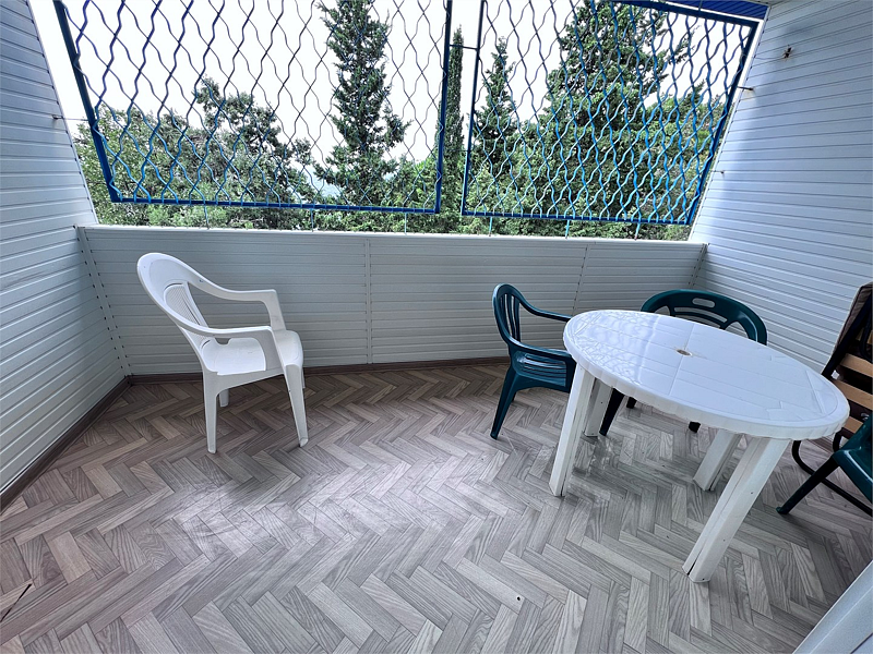 В номере двуспальная кровать, раскладной односпальный диван, телевизор, холодильник, кондиционер, прикроватные тумбочки, платяной шкаф, стол, стулья, ламинат, санузел (туалет, умывальник, душ). Балкон с видом на море.