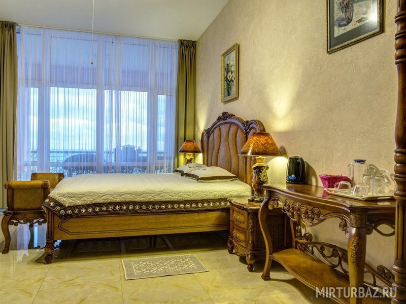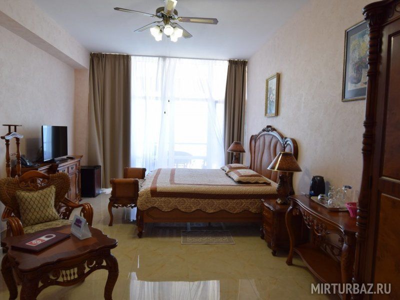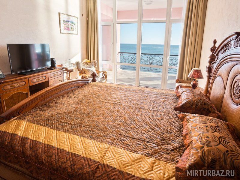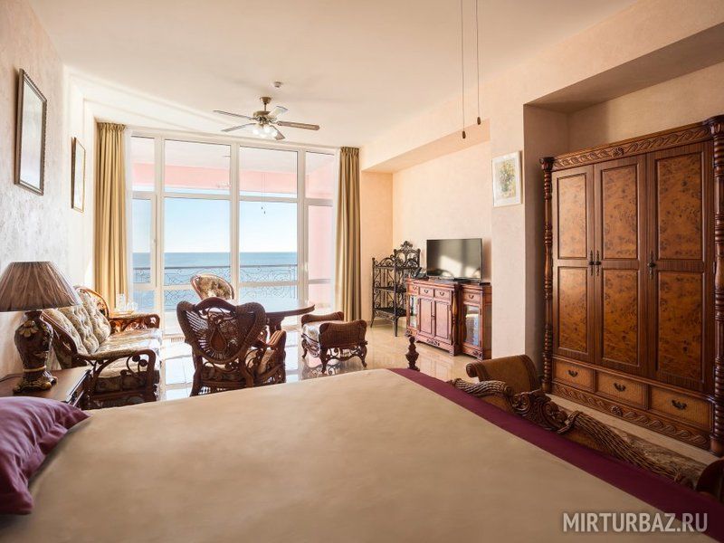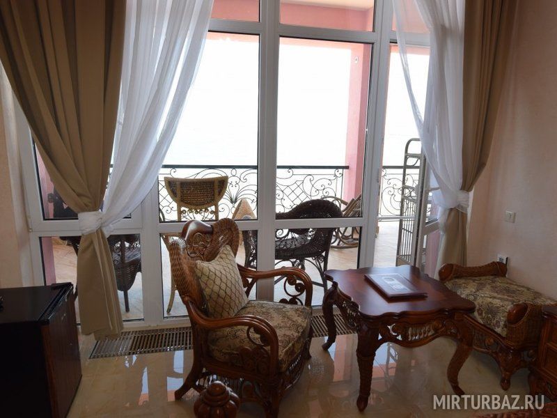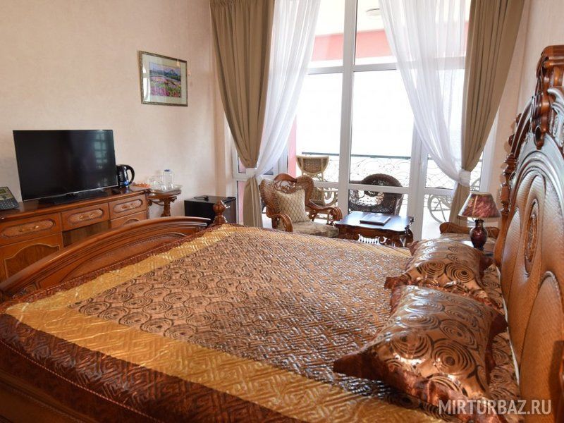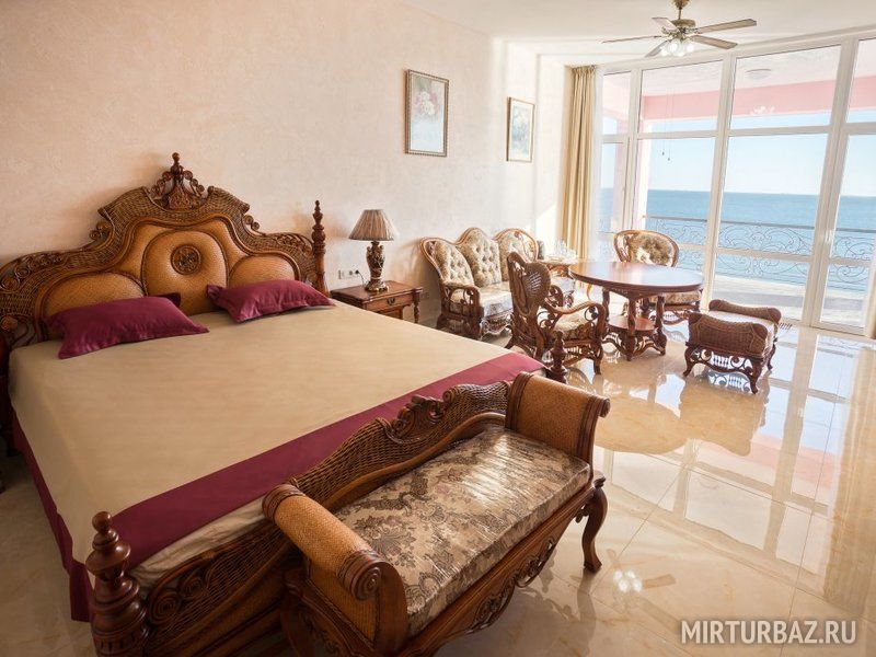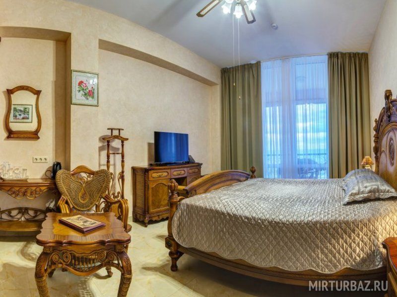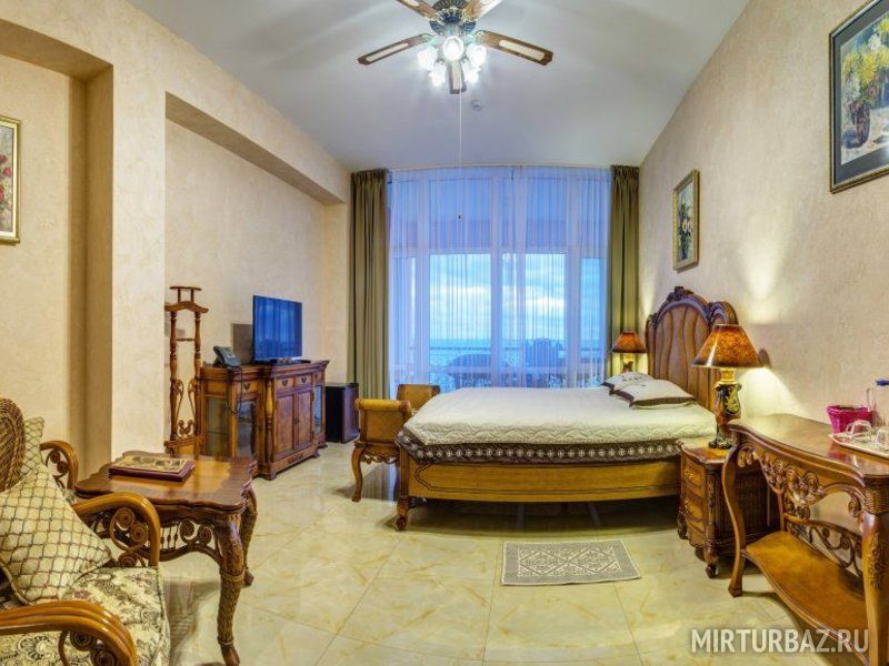 Эксклюзивная мебель и сантехника от ведущих производителей удивит тысячами невидимых глазу деталей, завершая художественный облик номера легкостью, красотой и функциональностью. В номере современная техника, спутниковое телевидение и оптоволоконный интернет. Оснащен выходом на веранду с ротанговой мебелью, откуда можно насладиться видом на побережье Черного моря.