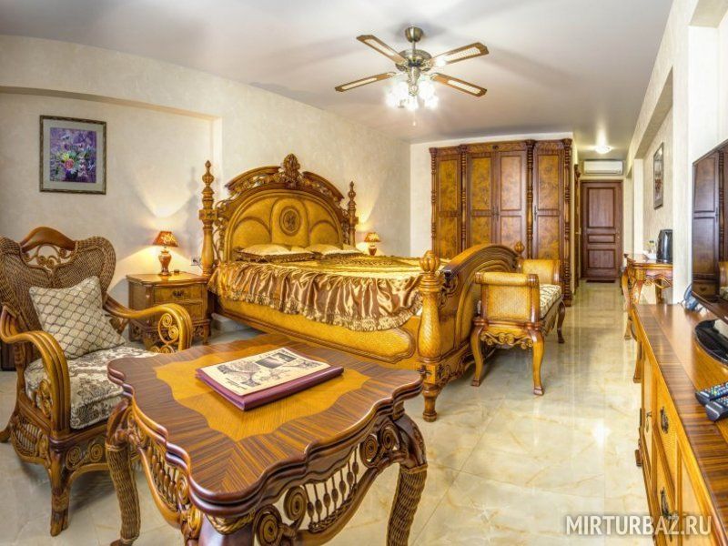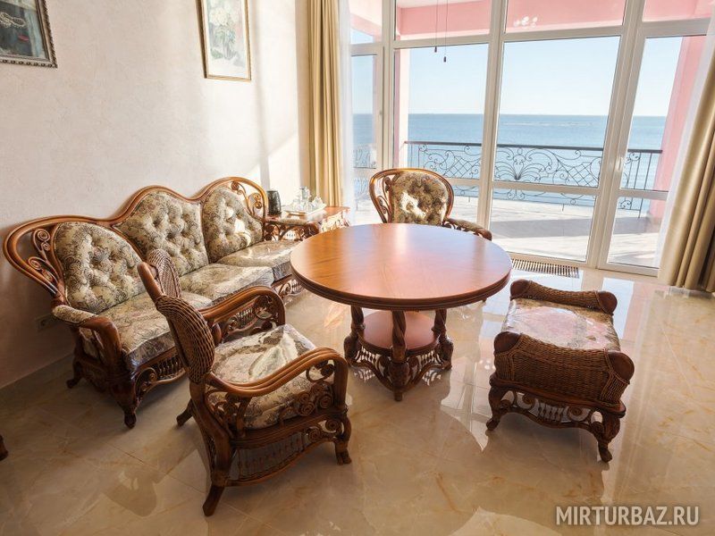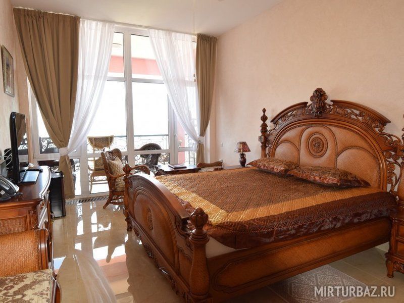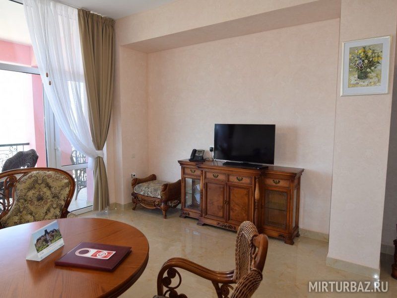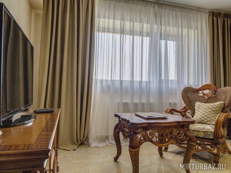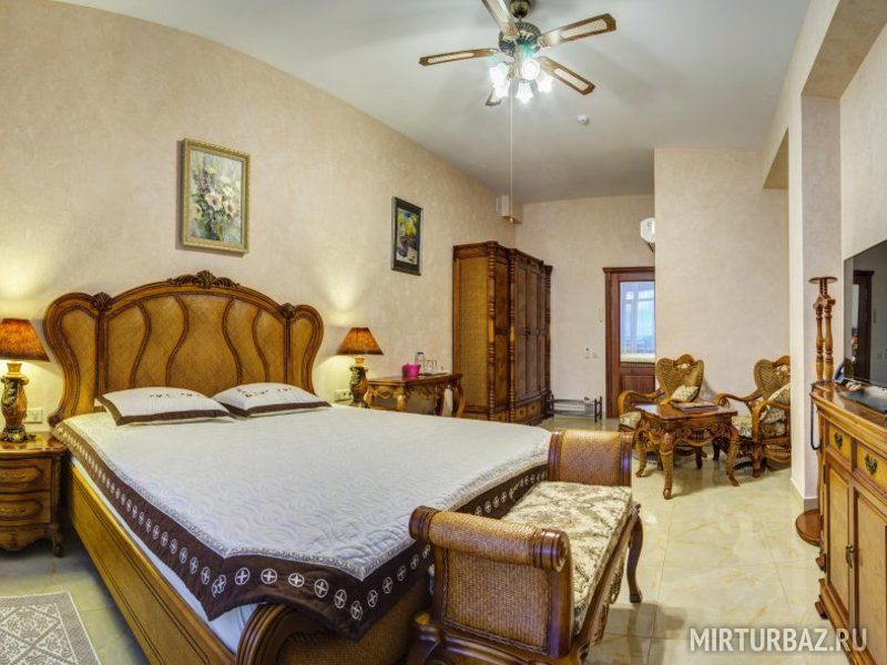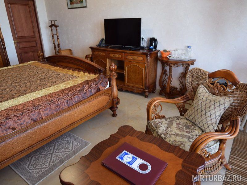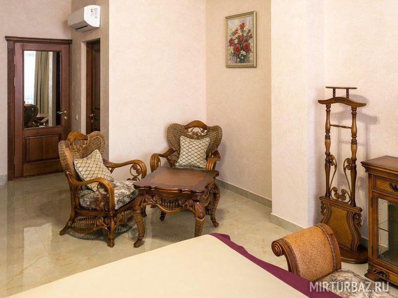 Эксклюзивная мебель и сантехника от ведущих производителей удивит тысячами невидимых глазу деталей, завершая художественный облик номера легкостью, красотой и функциональностью. В номере современная техника, спутниковое телевидение и оптоволоконный интернет. Оснащен выходом на веранду с ротанговой мебелью, откуда можно насладиться видом на побережье Черного моря.