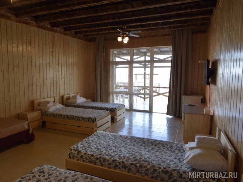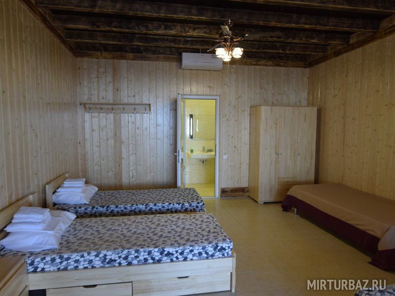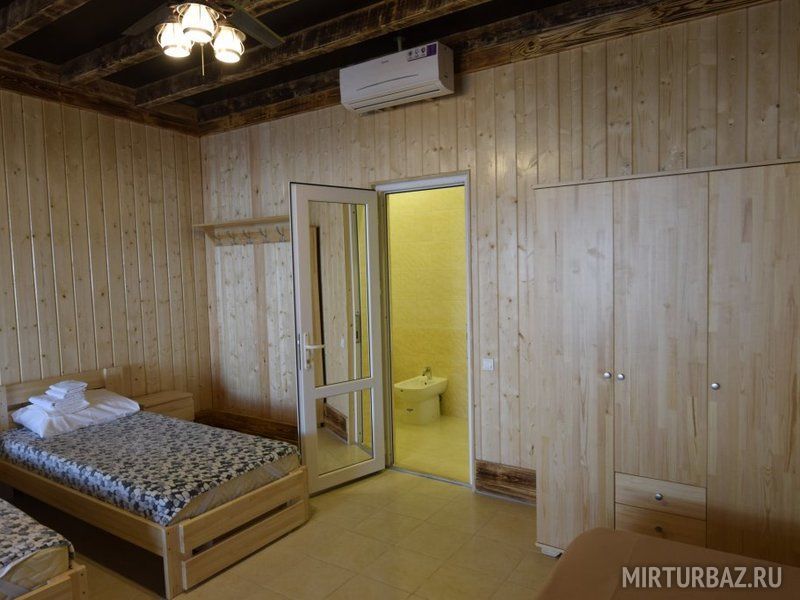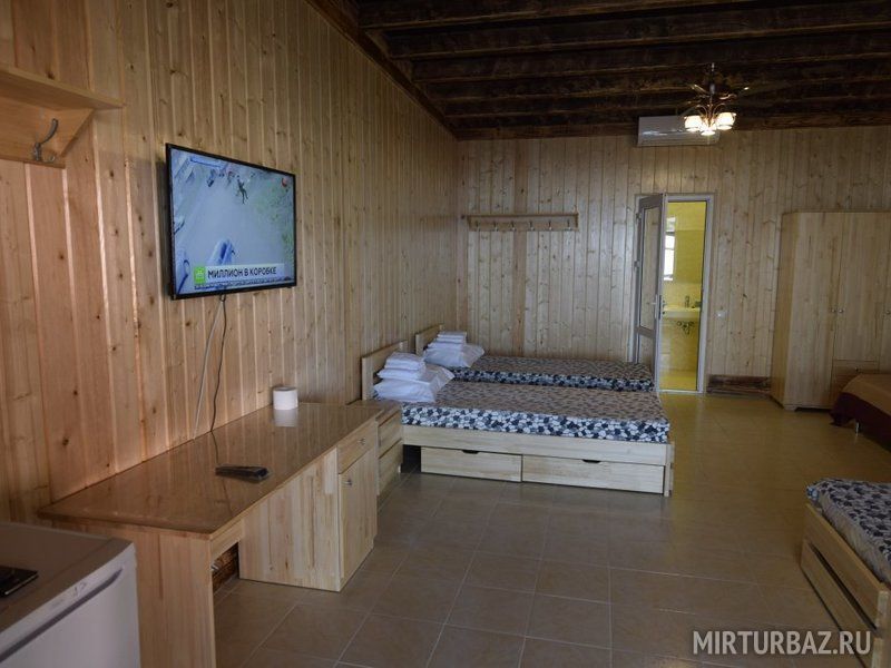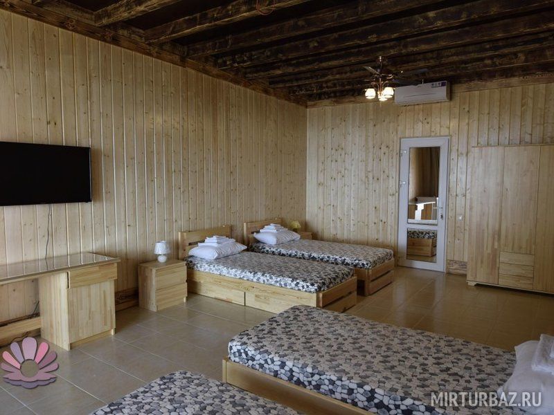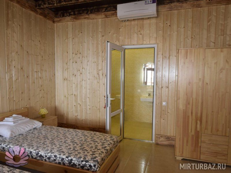 Под каждой кроватью два выдвижных ящика для вещей. При необходимости можно две кровати сдвинуть в двухспальную кровать. Сосновый стол, тумбочки и шкаф придают уют номеру и запах хвои. В номере также холодильник, кондиционер, плазменный телевизор 42 дюйма и wi-fi зона. В каждом номере душевая – 6 кв м с умывальником, унитазом и биде. Изюминка эко-номера - наличие 12 м кв. веранды с большим столом и видом на море с собственным песчаным пляжем в 10-15 метрах от номера.