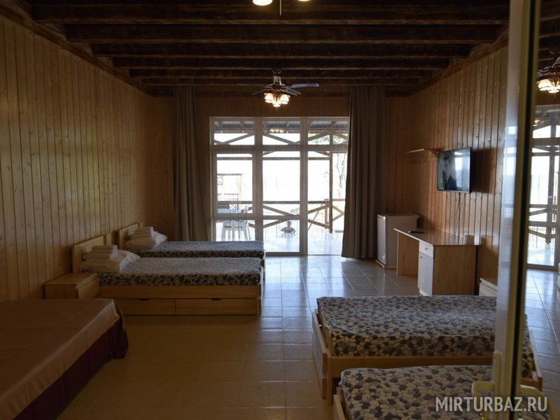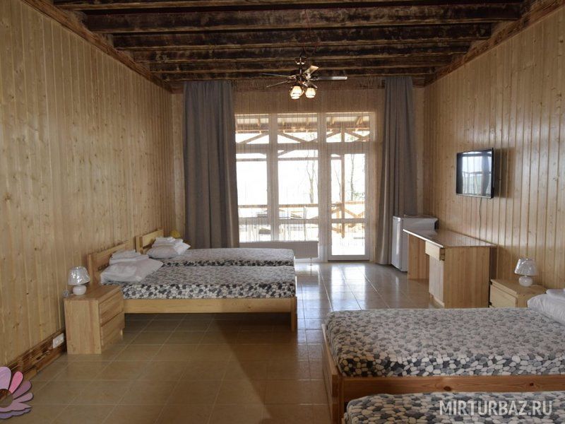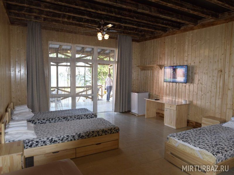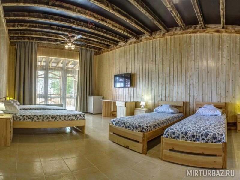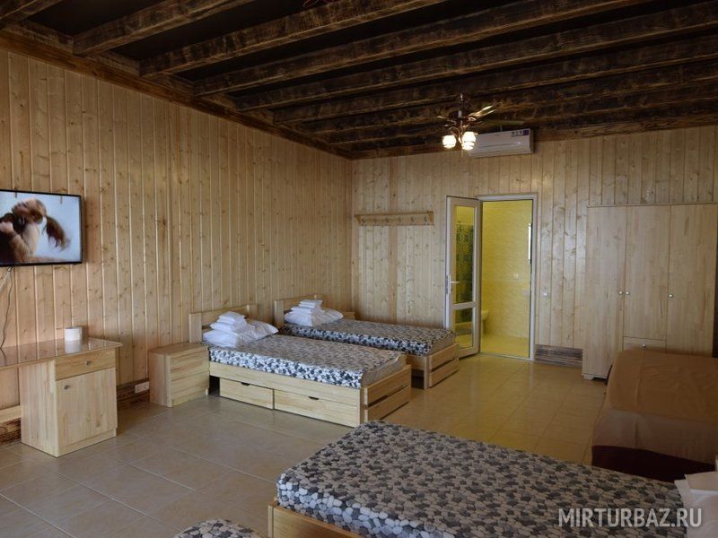 Под каждой кроватью два выдвижных ящика для вещей. Стены облицованы массивной доской из хвои. Сосновый стол, тумбочки и шкаф придают уют номеру и запах хвои. Номер выдержан в стиле кантри. Каждый номер оснащен холодильником, кондиционером, плазменным телевизором 42 дюйма и wi-fi зоной. Дополняет номер 12 м кв веранда с большим столом и видом на море с собственным песчаным пляжем в 10-15 метрах от номера.