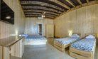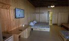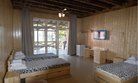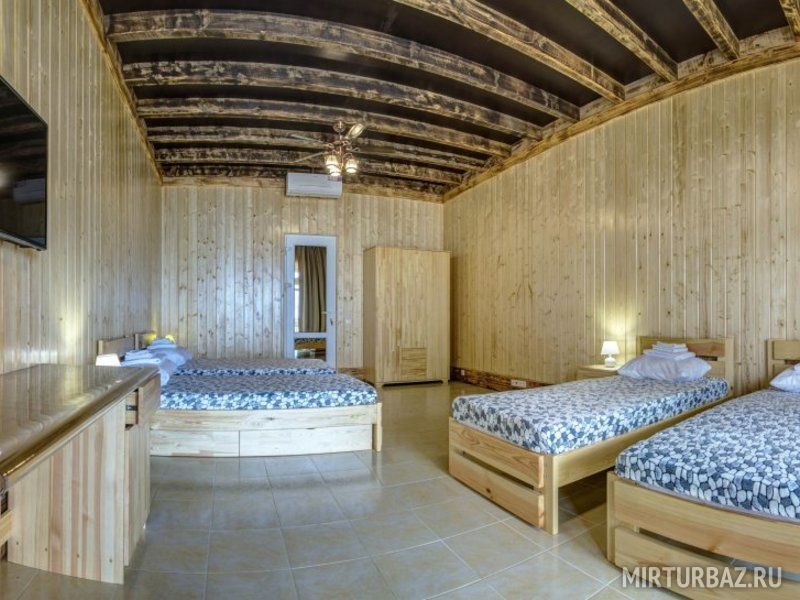 Стены облицованы массивной доской из хвои. В номере четыре кровати 90х200 из массива сосны с ортопедическими матрасами. Под каждой кроватью два выдвижных ящика для вещей. При необходимости можно две кровати сдвинуть в двухспальную кровать.