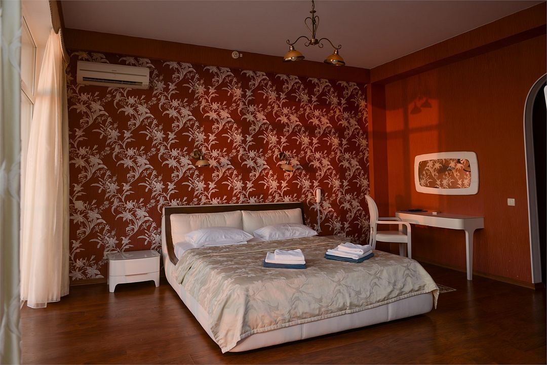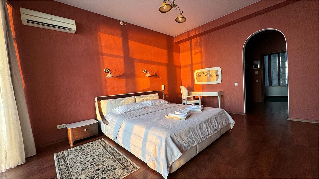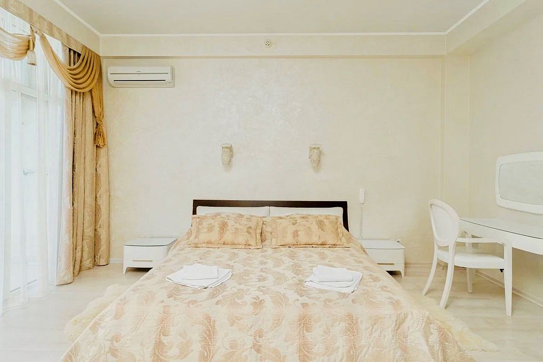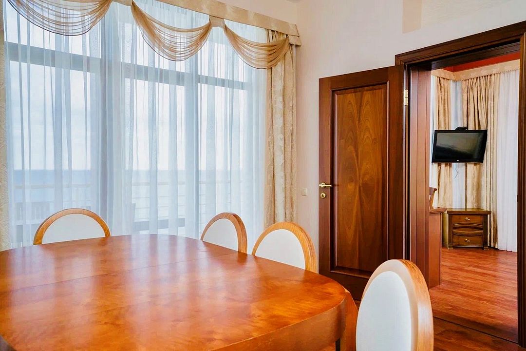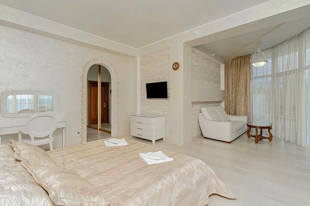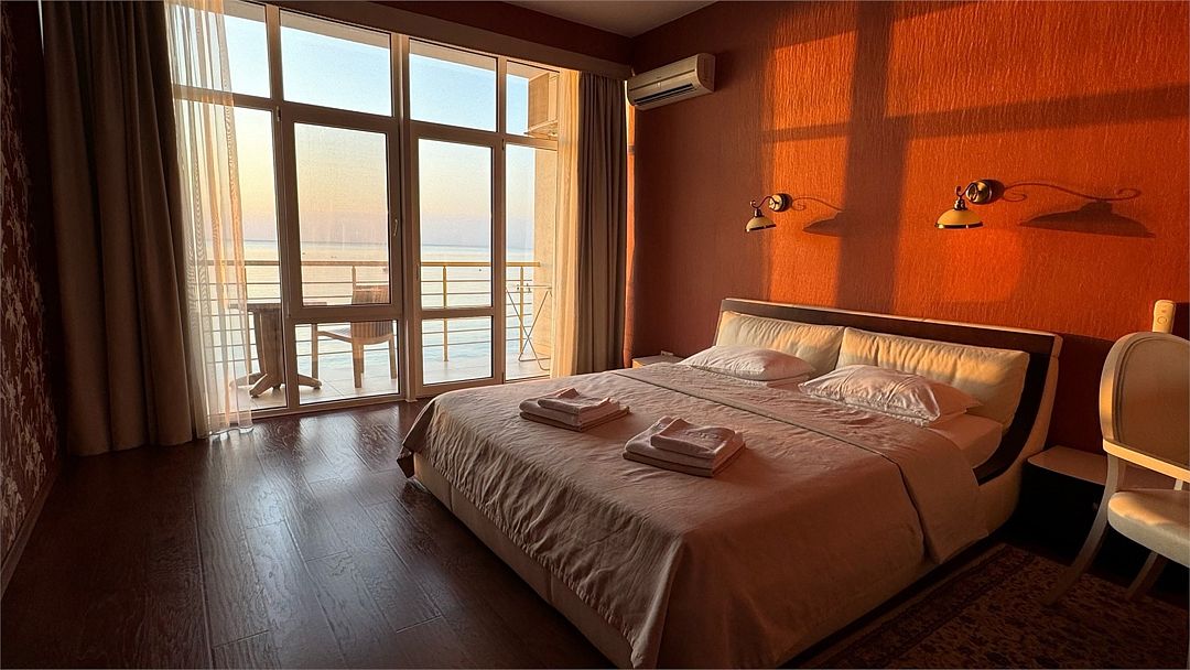 Просторный двухкомнатный номер с гостиной, спальной комнатой и кухней, площадью 60м2 с большим балконом выход на который из гостиной и спальной комнат. Кухня оснащена современной встроенной техникой и укомплектованная необходимым набором посуды. В гостиной большой обеденный стол, что позволяет гостям комфортно принимать пищу в номере. Ванная комната, оборудована ванной больших размеров. Максимальный комфорт, мечта, которая стала реальностью. Размещение детей старше 12 лет.Услуги и удобства
